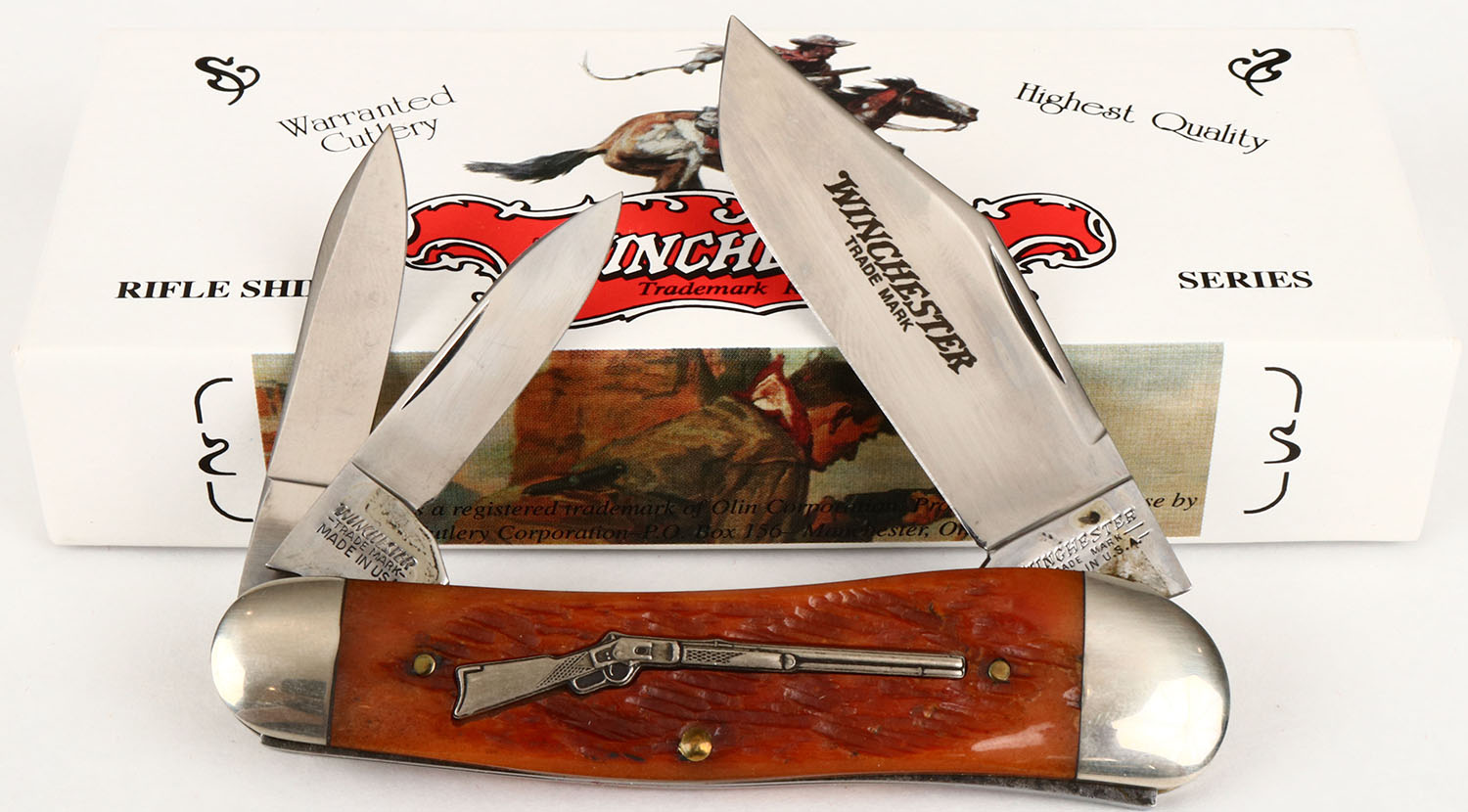 Winchester folding knife, in original box, W15 39118 1/2, burnt orange bone handle. Grade: MINT - Value: 40 to 100