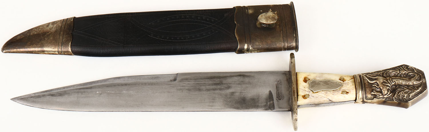 Large Edward Barnes & Sons bowie knife, 9 1/2 fixed blade, full hilt, has nickel and leather sheath, stag and handle with nickel pommel, handle is cracked. Grade: Very Good ++ - Value: 500 to 1500