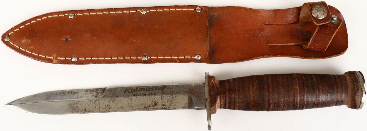 Large Kutmaster, leather washer handle and aluminum pommel, half hilt, 7 3/4'' blade, has leather sheath, knife has wear and age soiling. Grade: Good - Value: 10 to 50