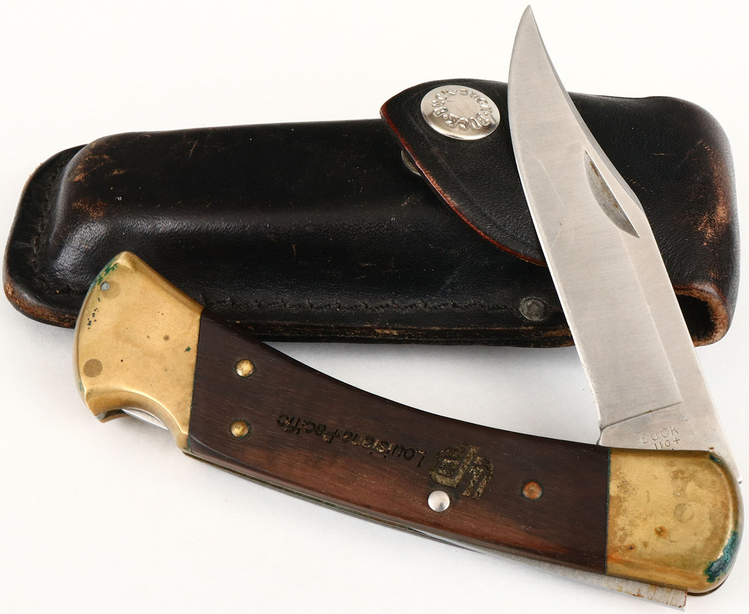 Buck folding knife, in orignal sheath, has age soiling and wear. Grade: Very Good - Value: 20 to 60