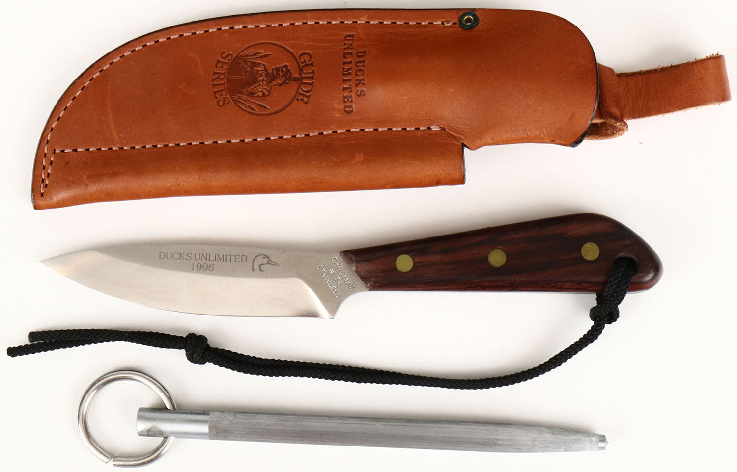 1996 DU fixed blade knife, ''DHRussell #3s Stainless'' on blade, has orignal sheath with sharpener. Grade: Excellent ++ - Value: 50 to 150