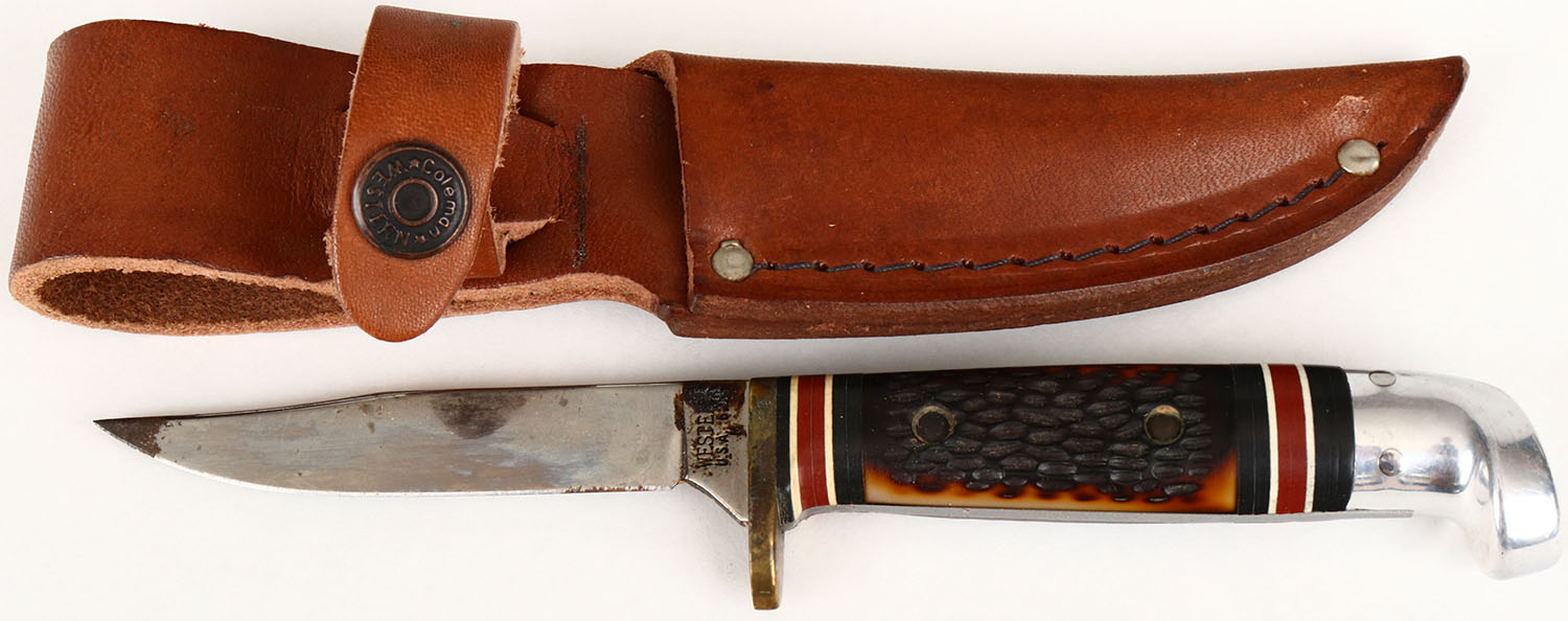Western knife, celluloid handles, fixed blade, 2 3/4'' blade, blade and handle has age soiling. Grade: Very Good - Value: 10 to 50
