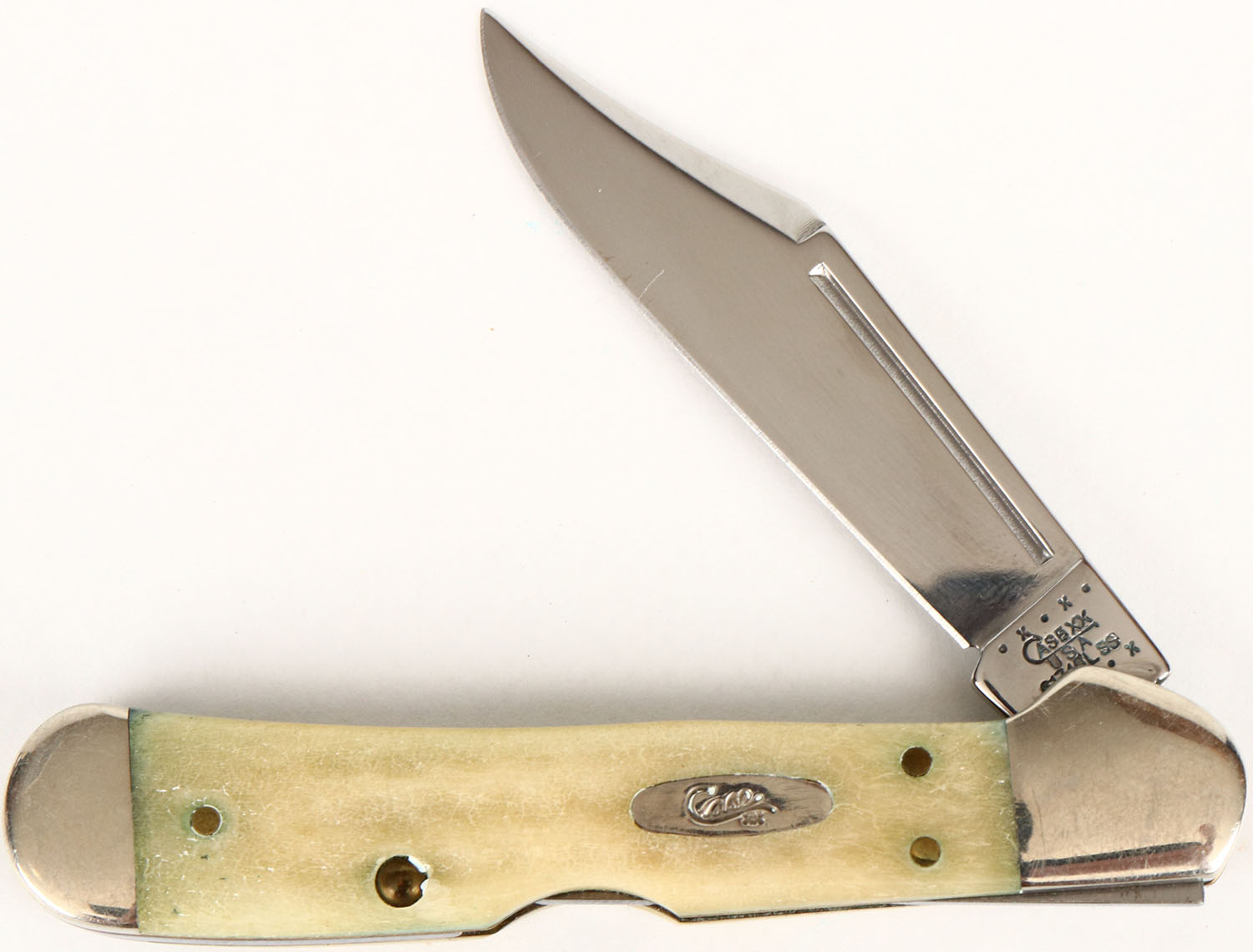 Case folding knife, white celluloid handle, 61749L SS marked on blade, all bright and clean. Grade: Excellent - Value: 30 to 90
