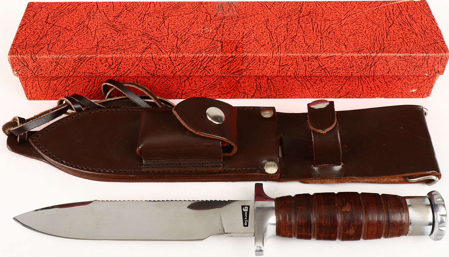 RARE! Garcia Survival Knife circa 1960, NIB, Jacques, Code- 900 0050, has leather sheath and sharpening stone, well marked, all bright and clean, has instructions inside, hard to find with orignal box! Grade: Excellent ++ - Value: 100 to 300