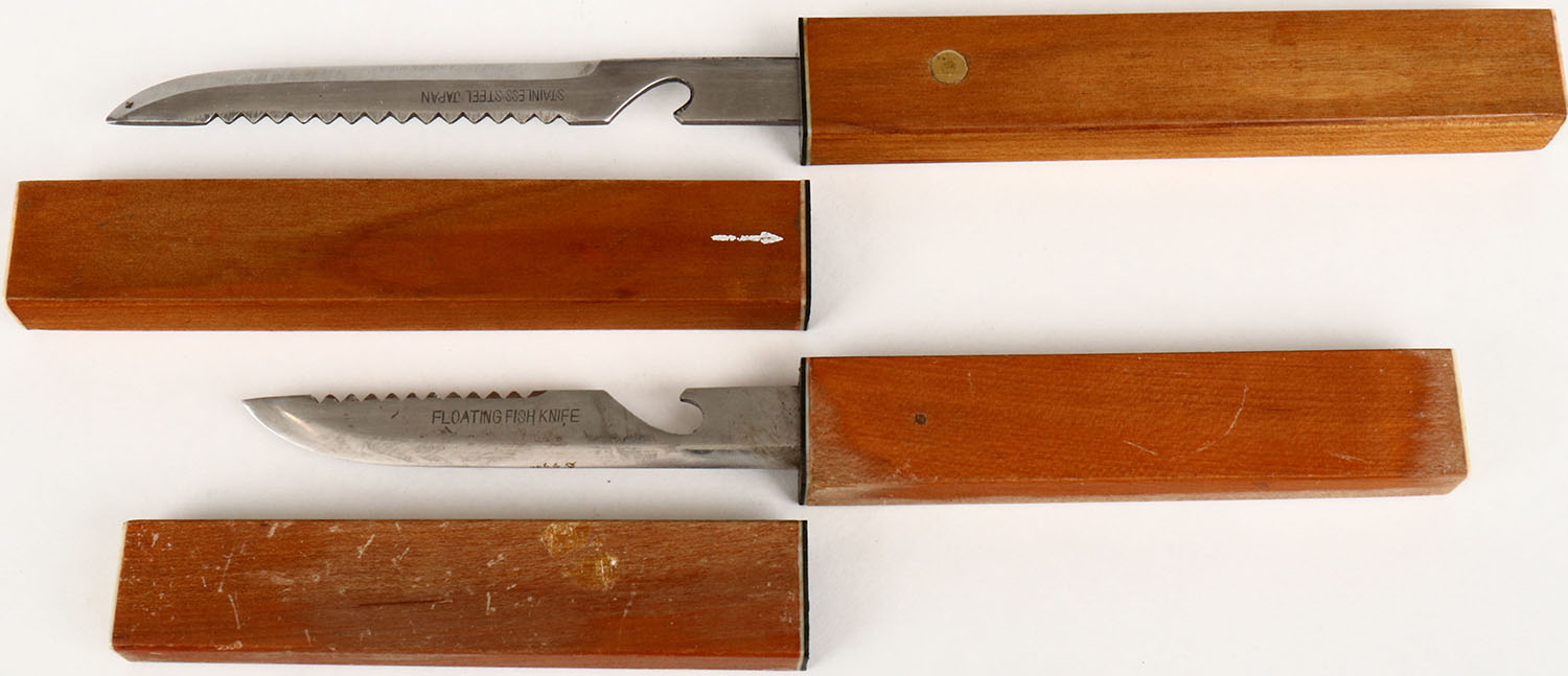 Lot of 2 floating fisherman's knives, wood handles and sheath. Grade: Very Good ++ - Value: 10 to 50