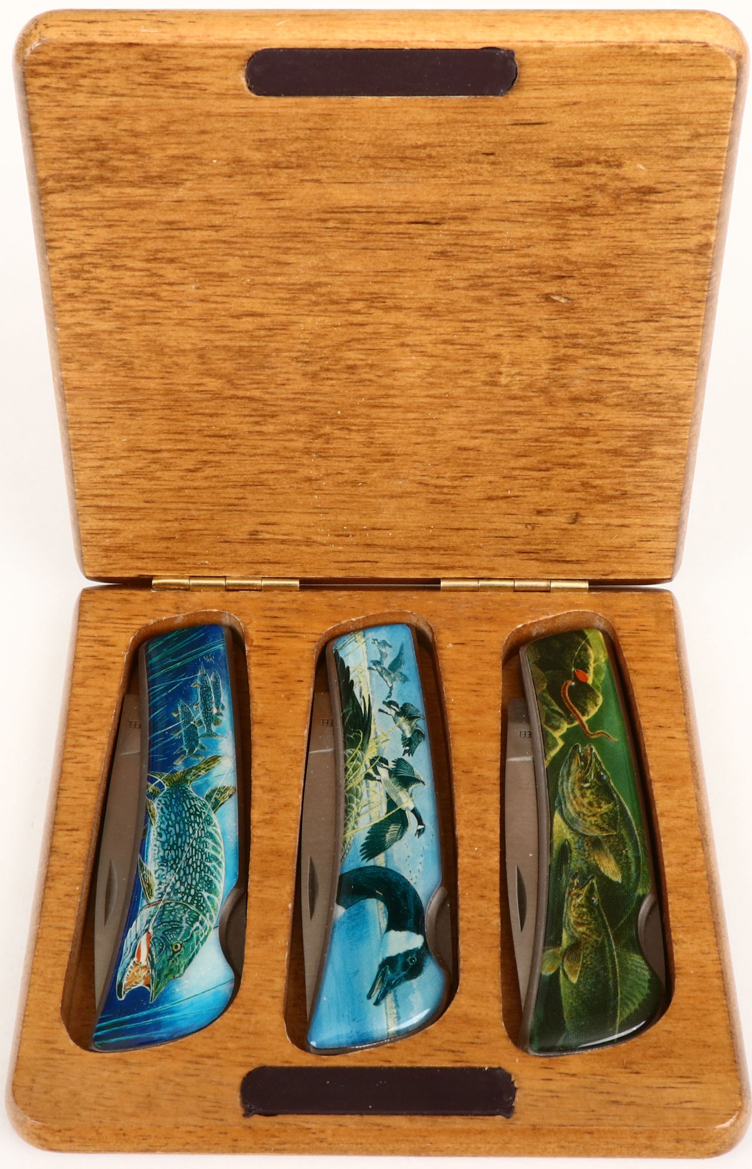 Set of 3 folding knives, 3 different images, in wood display box. Grade: Excellent - Value: 10 to 50