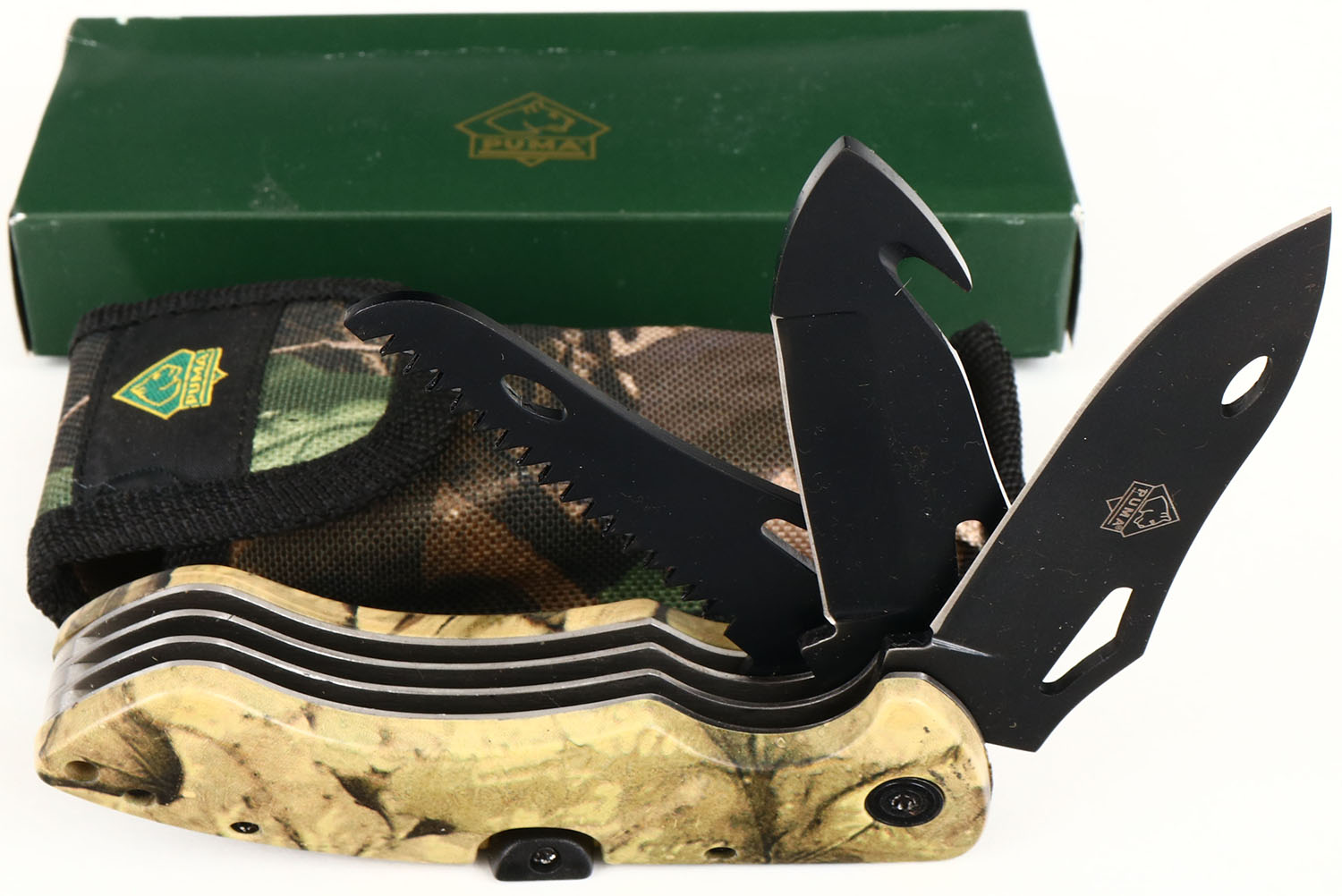 Puma folding knife in sheath with orignal box, camo knife and sheath, all bright and clean, 3 blades. Grade: Excellent ++ - Value: 50 to 100