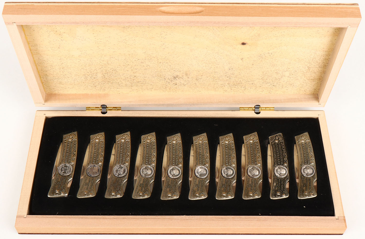 Knife set, 200th Constitutional Anniversary 1787-1987, 10 knives, in wood box. Grade: Excellent - Value: 30 to 90