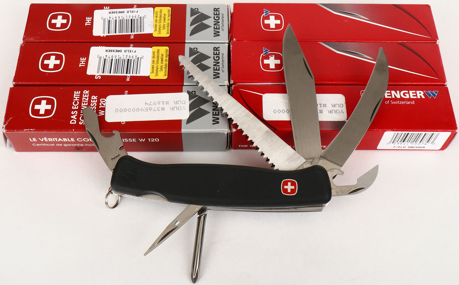Lot of 6 Wenger folding knives in orignal boxes, all NIB. Grade: Excellent ++ - Value: 20 to 250