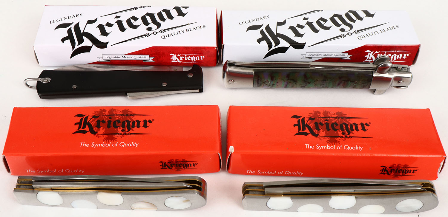 Lot of 4 Kriegar folding knives in orignal boxes, all NIB. Grade: Excellent ++ - Value: 10 to 50