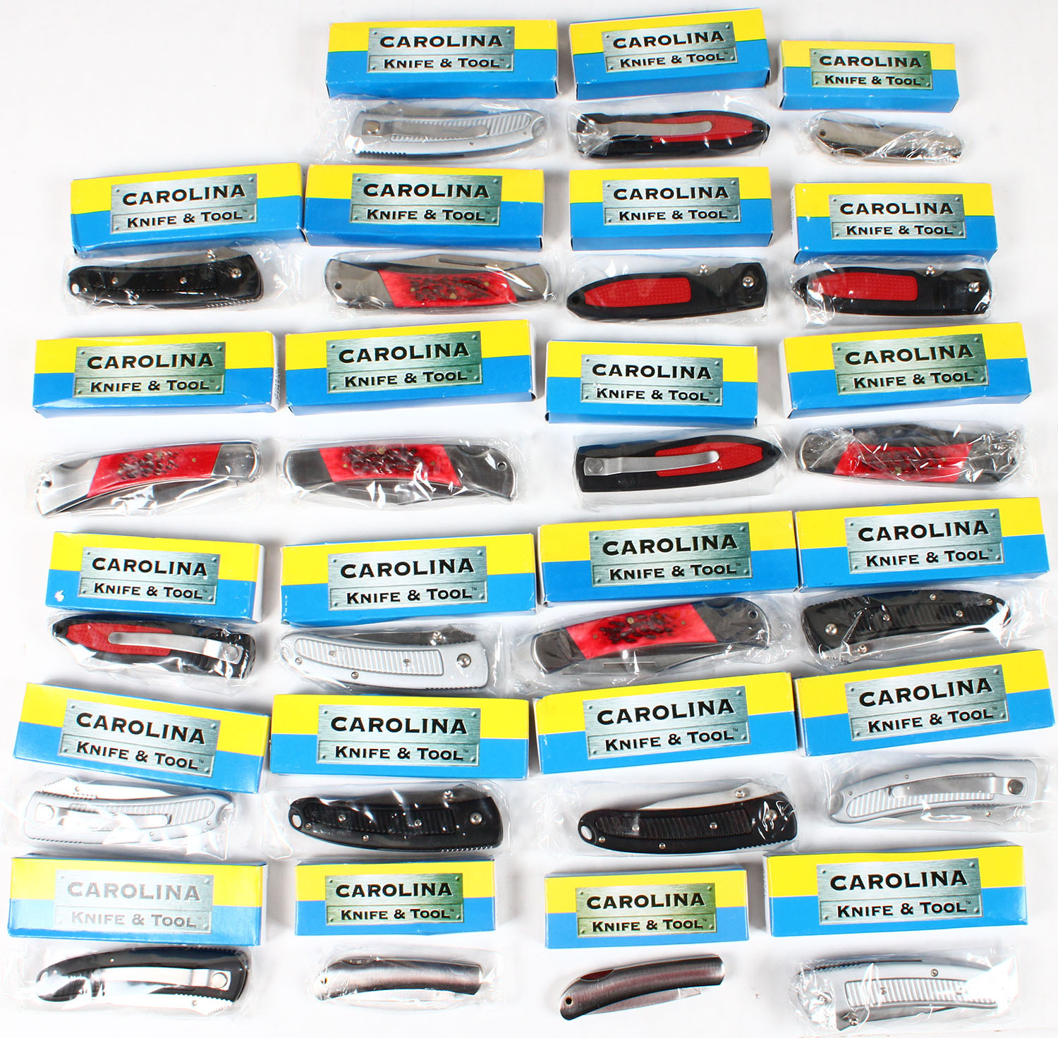 Very large lot of Carolina Knife & Tool Co. folding knives in orignal boxes, all NIB. Grade: Excellent ++ - Value: 50 to 200