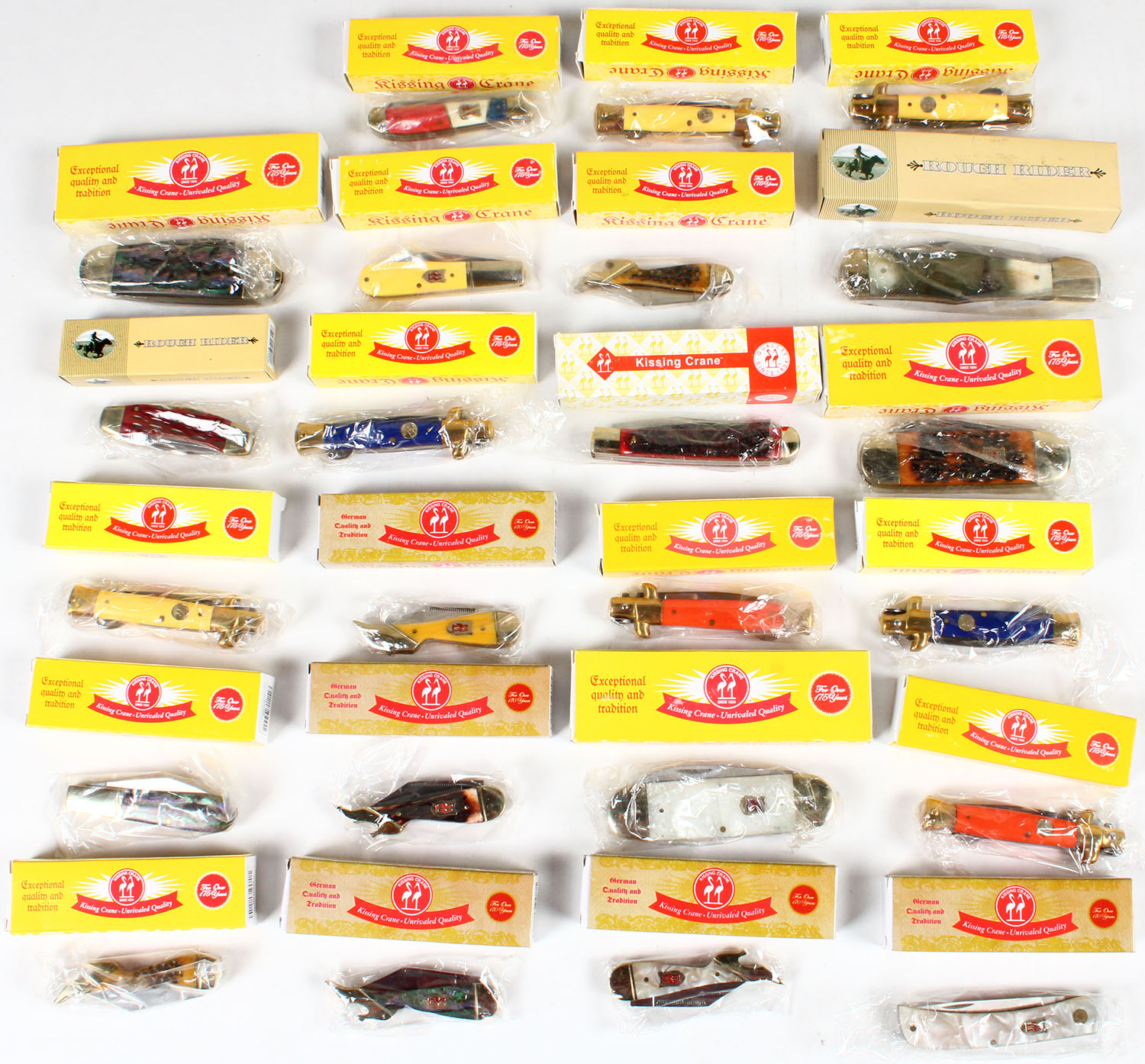 Very large lot of Kissing crane folding knives in orignal boxes, all NIB. Grade: Excellent ++ - Value: 50 to 150