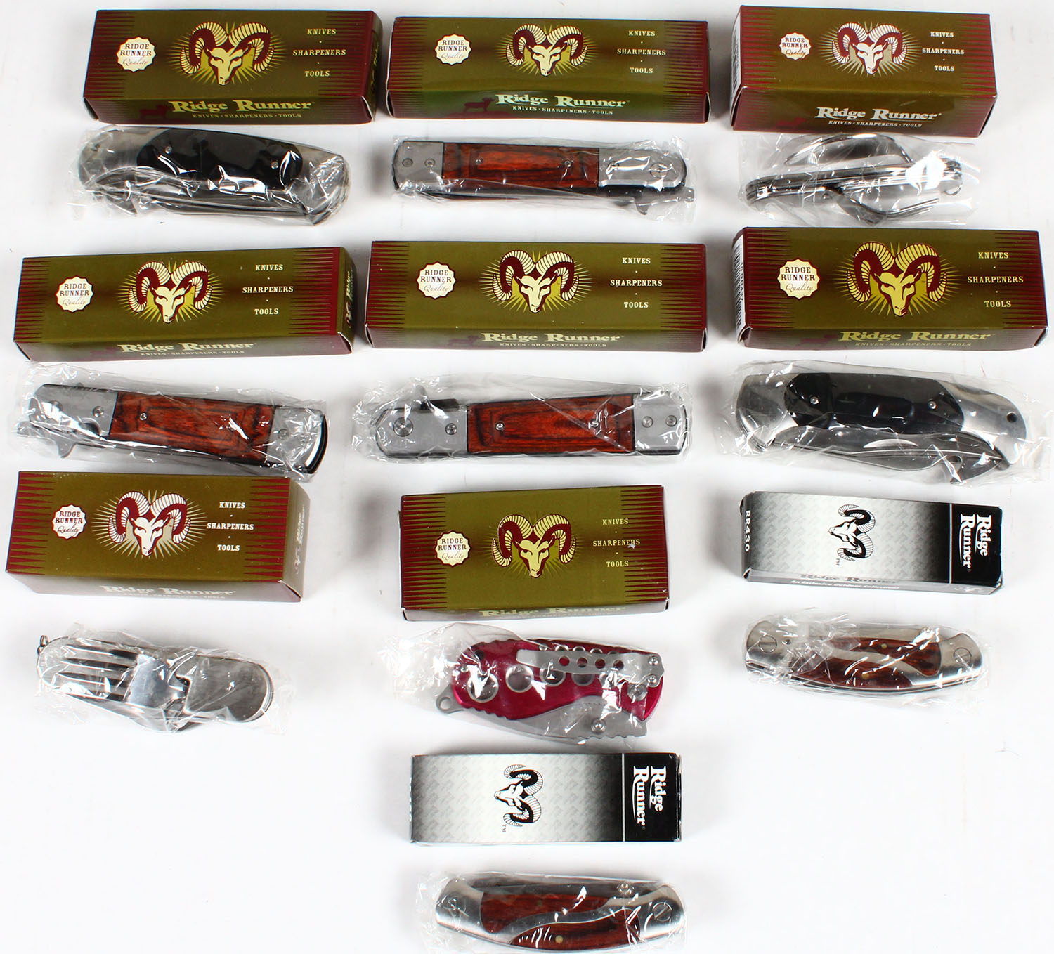 Very large lot of Ridge Runner folding knives in orignal boxes, all NIB. Grade: Excellent ++ - Value: 50 to 150
