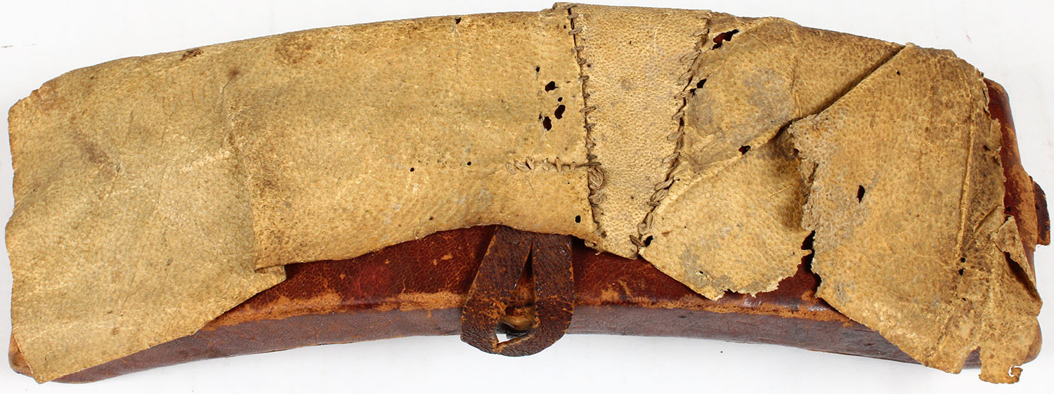 RARE! Frontier made cartridge holder for a dozen rounds. Wood leather covered with flap for waterproof. Waterproof cover of pigskin. Most probably used by a buffalo hunter. Holes drilled for a Sharps cartridge. Once had a belt now missing. A one of a kind. Grade: Good ++ - Value: 50 to 200