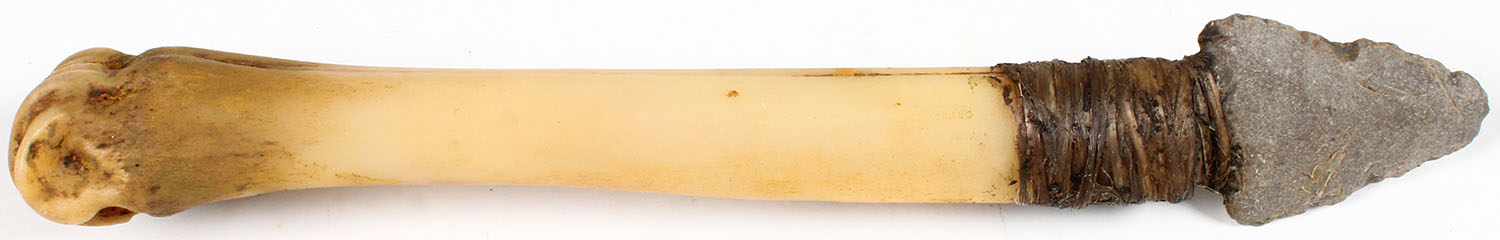 RARE! Very Early Deer leg bone flint knife, has original flint blade attached with snew and bison dung glue with pitch, 8 1/2; OAL. Grade: Good ++ - Value: 50 to 500