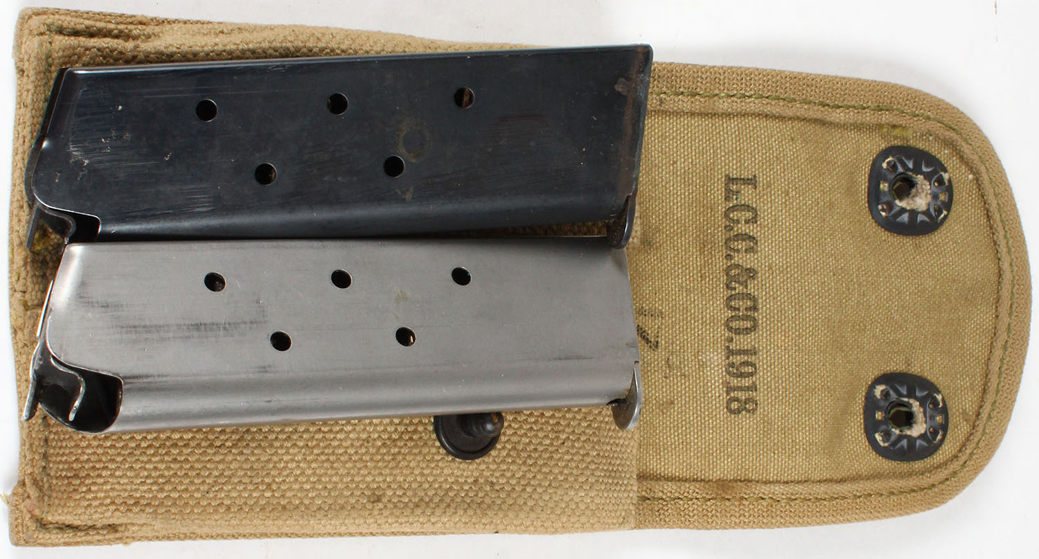 Lot of 2 pistol mags., in canvas pouch, 1 mag marked .45 cal and pouch marked LCC & Co. 1918. Grade: Very Good - Value: 20 to 100