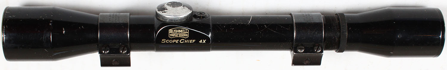 Bushnell Scope Chief 4x, shows wear, clear view, crosshair reticle. Grade: Very Good - Value: 6 to 60