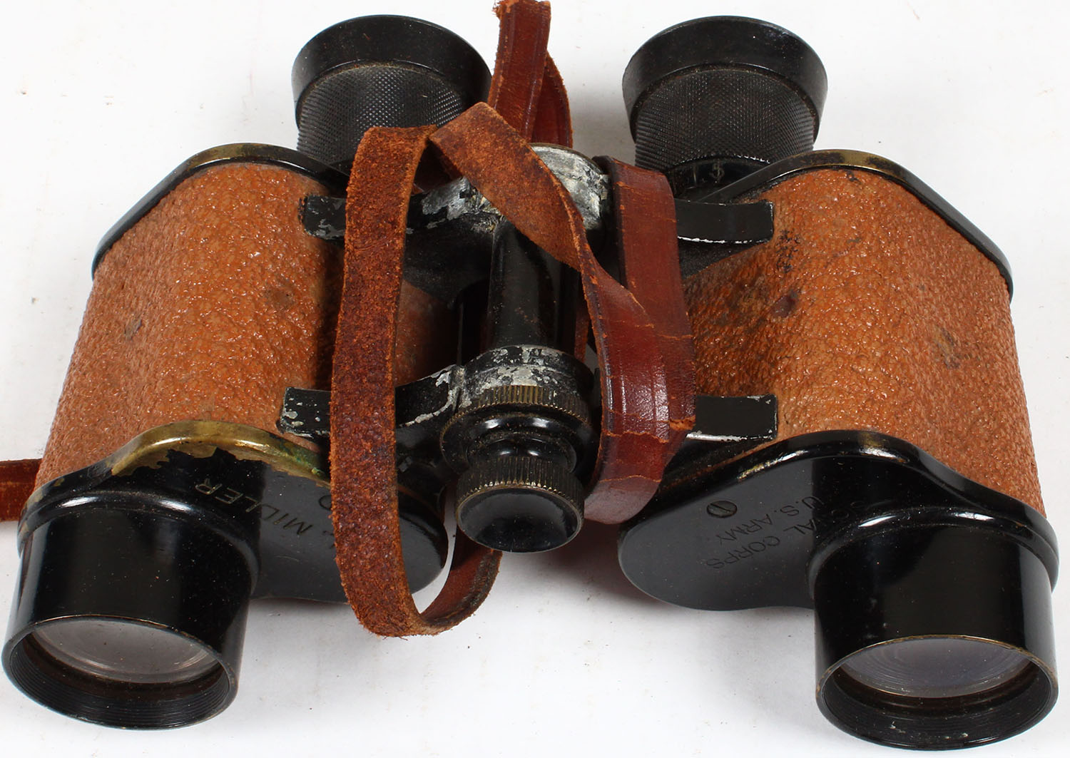 Antique binoculars, made by Bausch and Lomb , US ARMY, Al Miller, has leather grip has wear. Grade: Very Good ++ - Value: 20 to 250