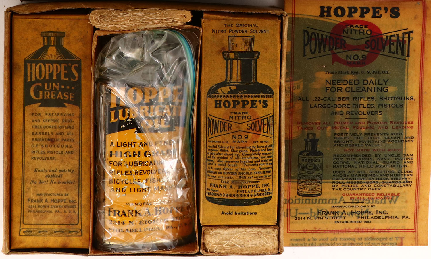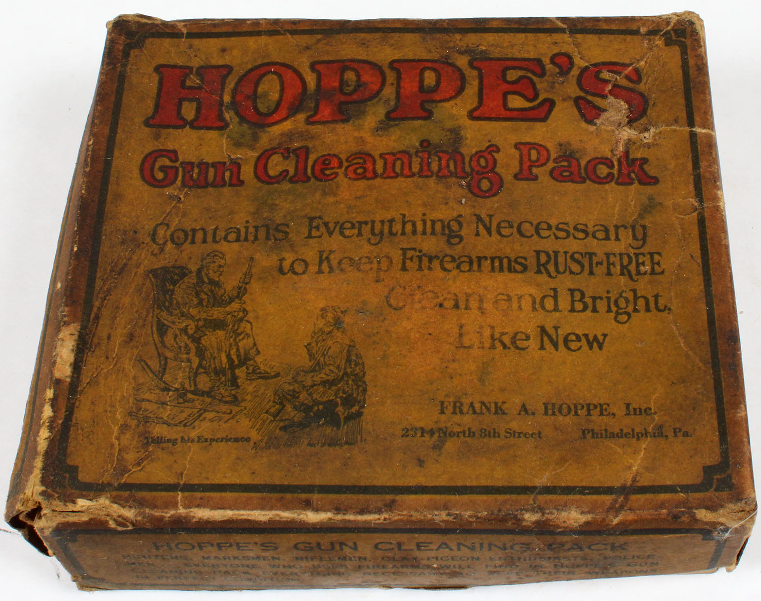 Hoppes Gun Cleaning Pack, Full Kit with oil tin, Very Early, has age soiling to contents and box. Grade: Very Good - Value: 16 to 80
