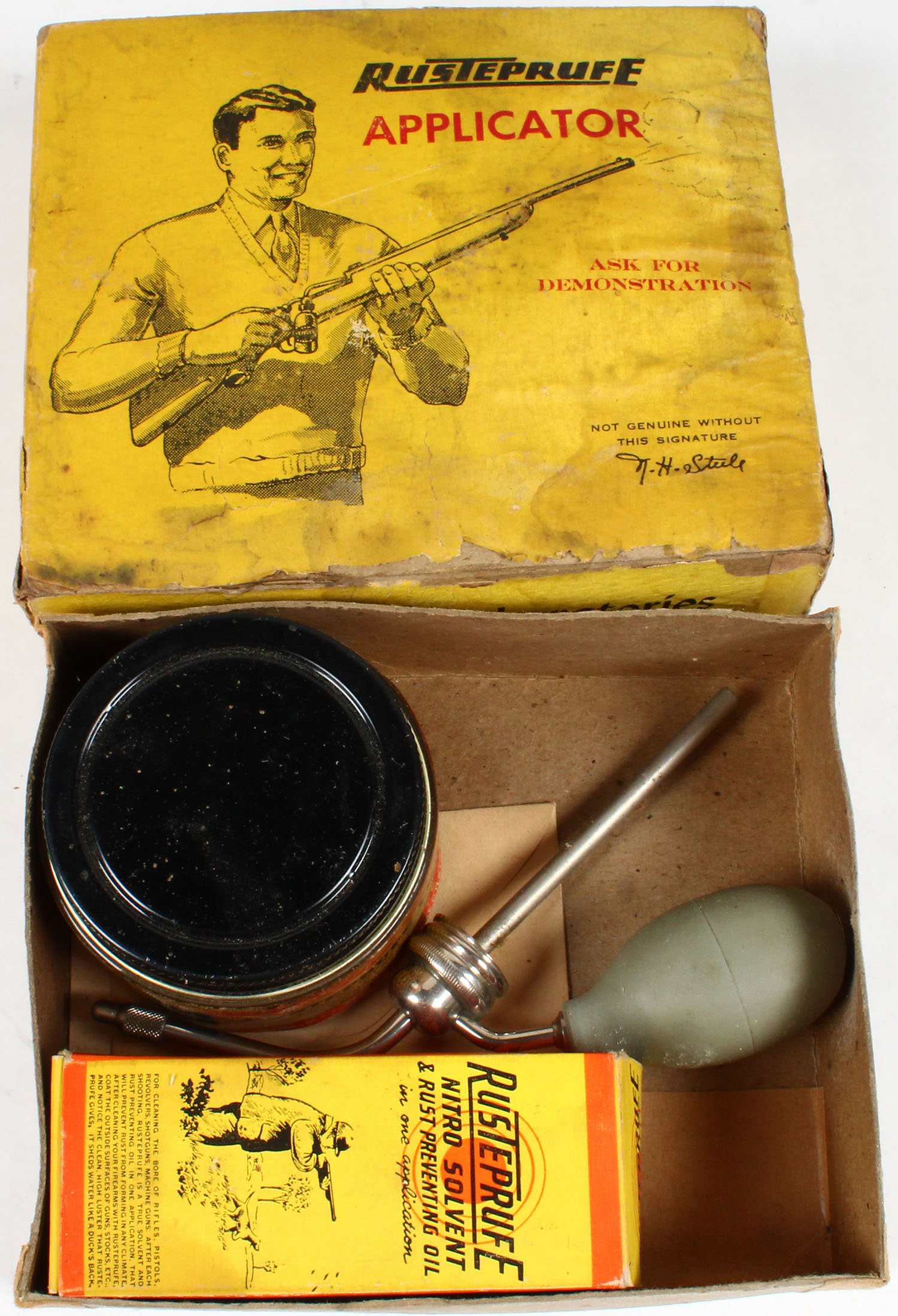Rustepruff Applicator in orignal box, Full and Complete, box has age soiling and water damage, inside contents are solid. Grade: Very Good - Value: 10 to 40