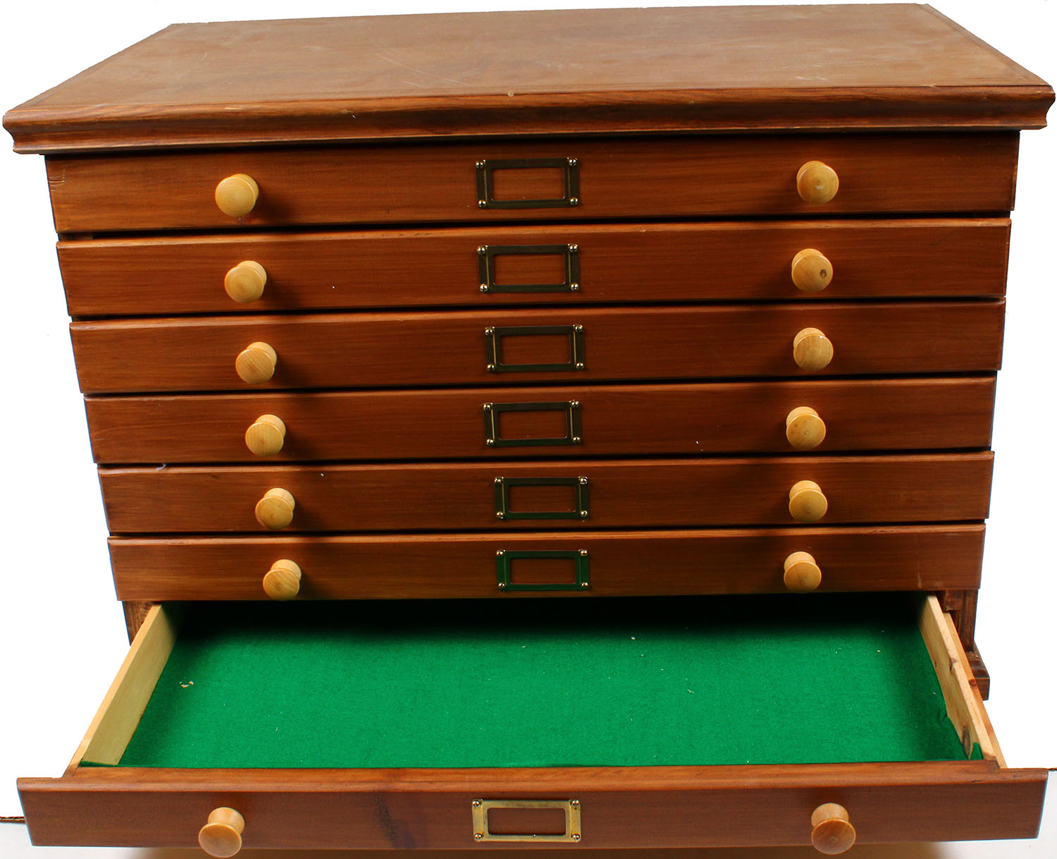 Wood Display cabinet, Dimmensions: 24'' x 18'' x 15'' , 7 drawers with knobs and brass box to display the contents, with green felt in draw, very nice! Great for any collection. Grade: Excellent ++ - Value: 20 to 300