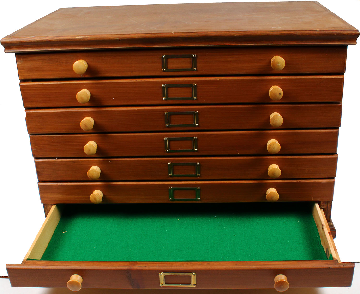 Wood Display cabinet, Dimmensions: 24'' x 18'' x 15'' , 7 drawers with knobs and brass box to display the contents, with green felt in draw, very nice! Great for any collection. Grade: Excellent ++ - Value: 20 to 300