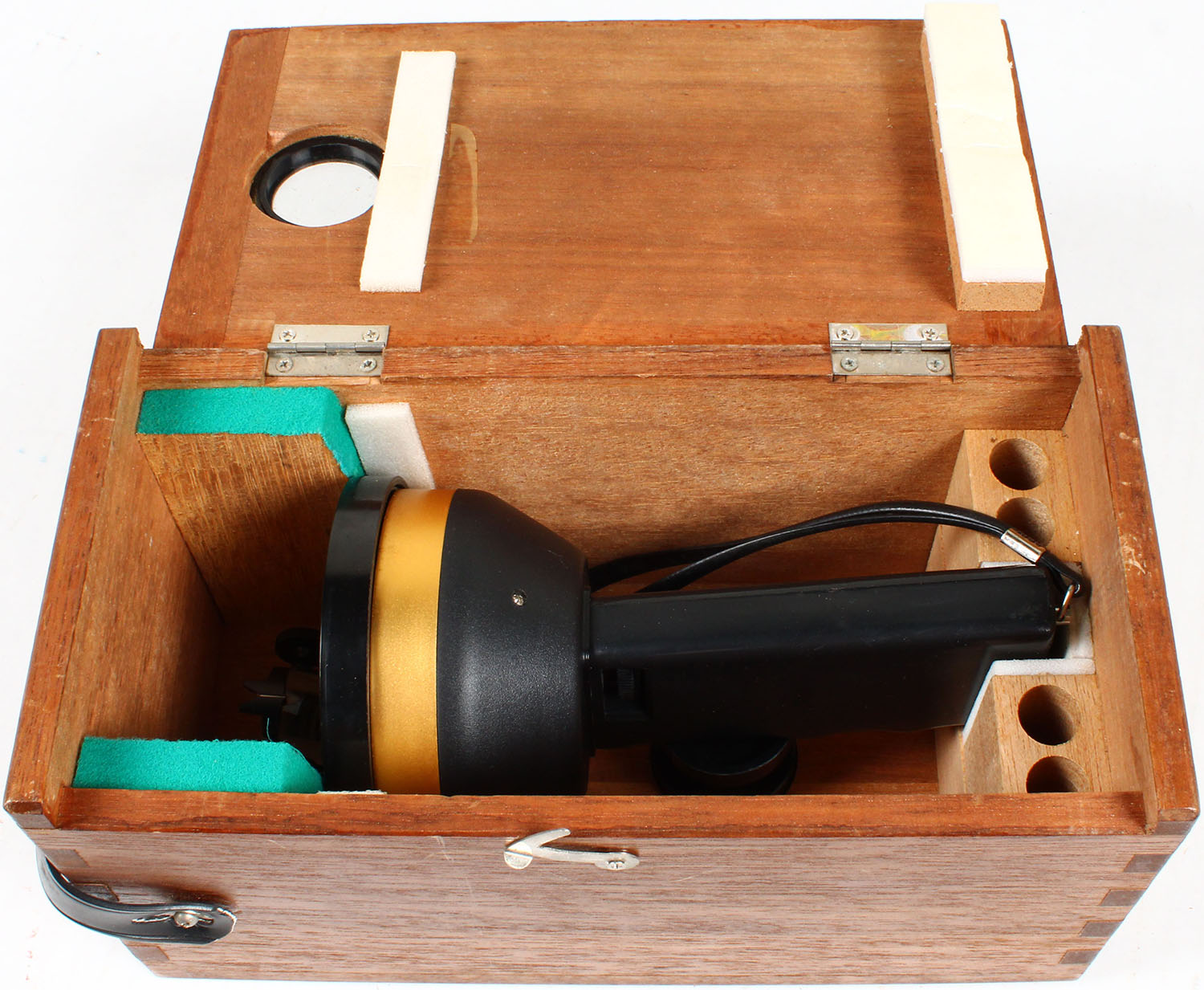 RARE! Hand Held Weems & Plath Inc bering compass with original wood case, made in Japan, box has glass hole with on & off knob on back side, this allows you to be able to use the tool in the box with inside reflecting mirrors. Grade: Excellent - Value: 40 to 200