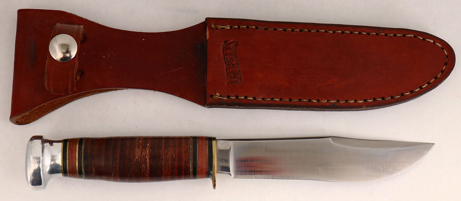 Marbles fixed blade knife, in original sheath, 5 '' blade, half hilt, leather washer handle, aluminum pommel, solid and clean. Grade: Excellent - Value: 60 to 250