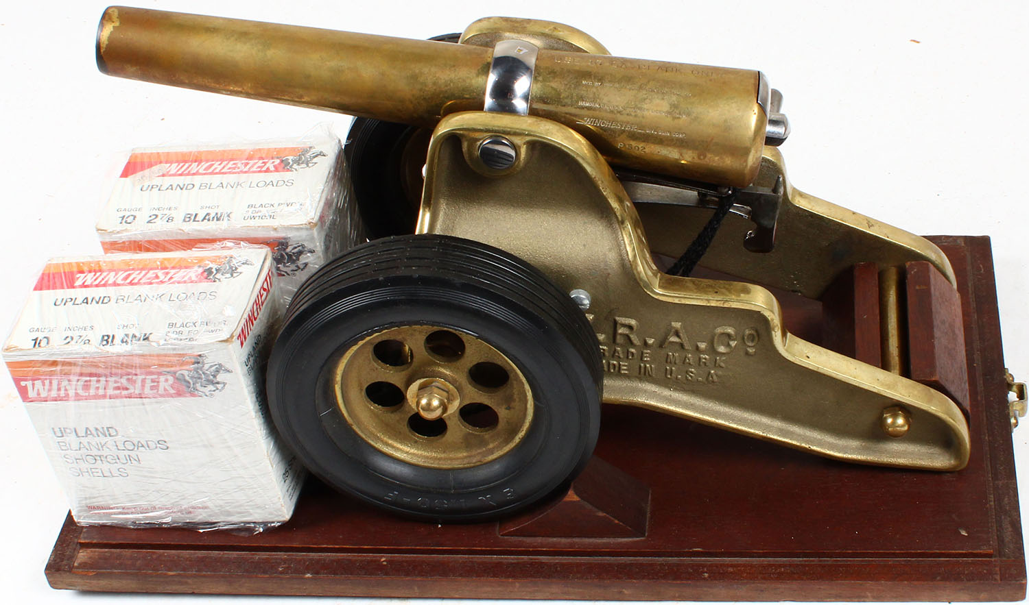 RARE! Bellmore Johnson Winchester 10 ga. Golden color Winchester Cannon, with wood box. Rubber wheels, #P 502, the famous Winchester Model 98 Breech Loading Signal Cannon was first offered in Winchester's 1903 catalog. It was described as: ''a breech loading cannon possessing safety, simplicity of construction, and ease of manipulation....'', The cannon is manufactured using the specifications from original Winchester blueprints. The barrel, machined from solid round bar, is mounted on a cast iron undercarriage that is cast using original patterns from Winchester. The barrel and undercarriage have a durable electro-coated finish, and the breech closure is hardened black. Very nice piece! Well marked, has some Winchester 10 ga. Blank shells, has some wear. Grade: Excellent - Value: 1000 to 2000