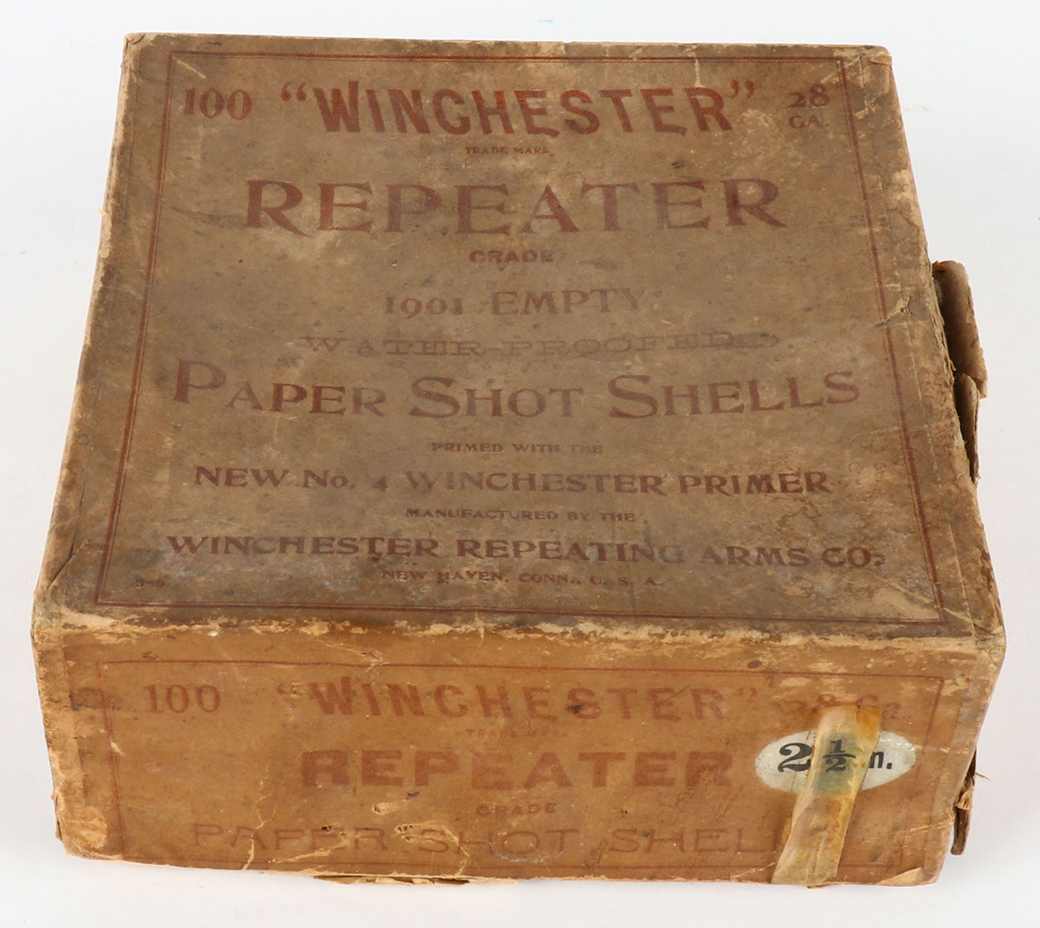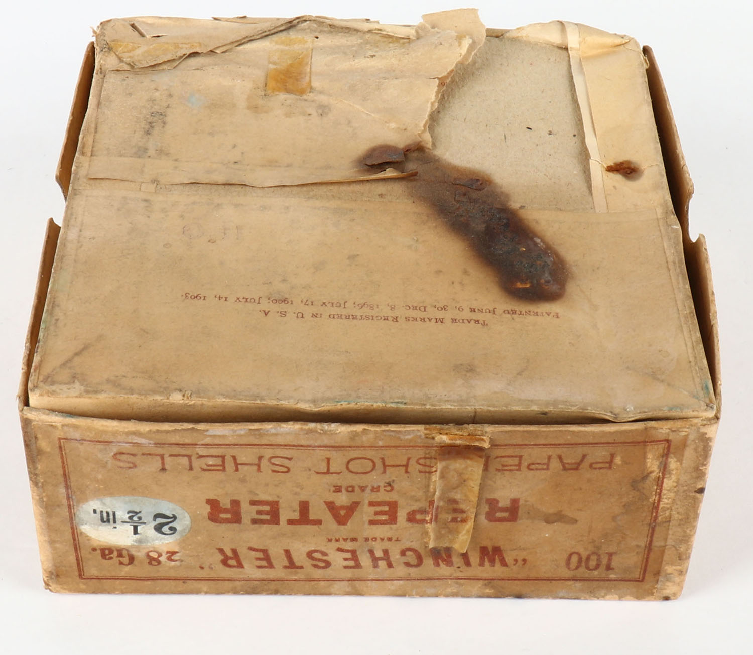 Winchester, Repeater, NPE, 28ga., 2pc., Empty, 2 1/2'', buff box with buff and red label, box has age soiling & scuffing, with edge & corner wear, bottom has tears and what appears to be a burn mark. Grade: Good + - Value: 100 to 500