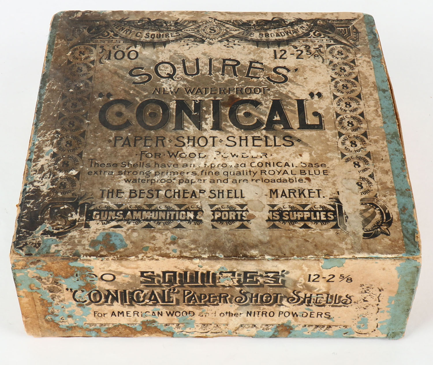 Squires, ''Conical'', NPE, 12ga., 2pc, Empty, 2 5/8'', buff box with buff and blue label, box has scuffing with age soiling, has a missing end flap with edge wear. Grade: Good ++ - Value: 300 to 1000