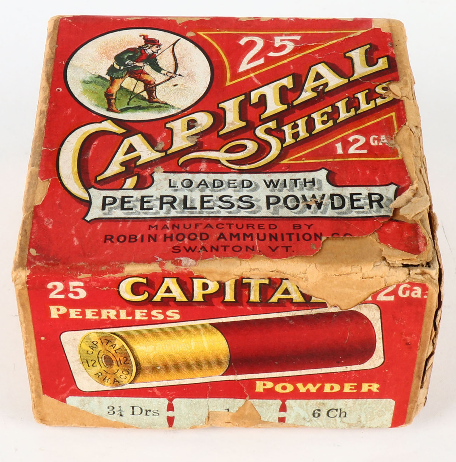VERY RARE!!! Robin Hood Ammunition Co., PEERLESS POWDER, 12ga., 2pc., Empty, shot size 6Ch, buff box with red, white & black label that pictures a multi colored Robin Hood, 3 1/4 Drs., box has some age soiling, with edge wear & a partial seam split, label is Original with a tape repair on the inside of box. Grade: Very Good ++ - Value: 2000 to 10000