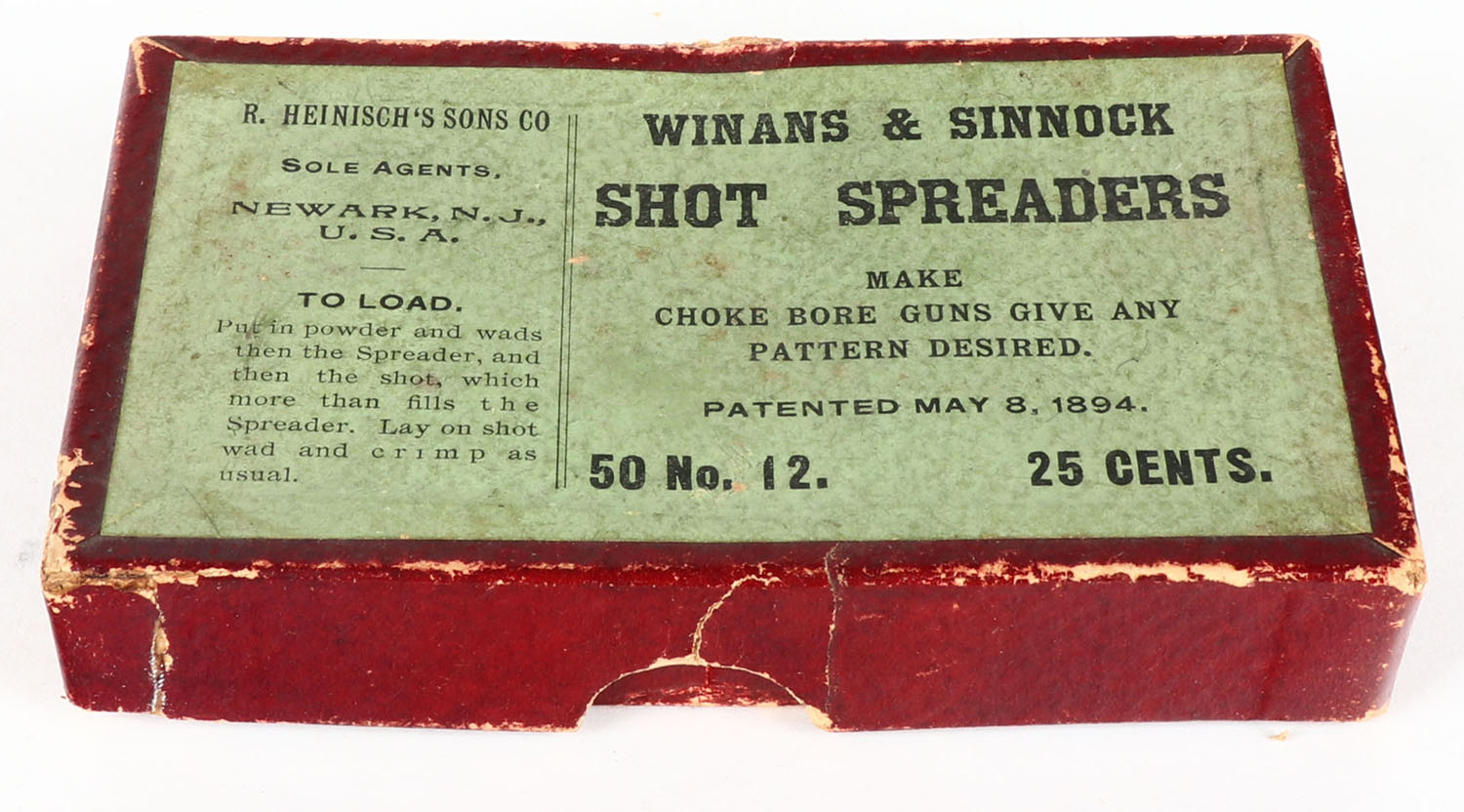 R. Heinisch's Sons Co., Winans & Sinnock, Shot Spreaders, 12ga, 2pc., Partial 41 shot spreaders, red box with green & black label, box has edge wear with light scuffing, shot spreaders are very good. Grade: Very Good ++ - Value: 40 to 80
