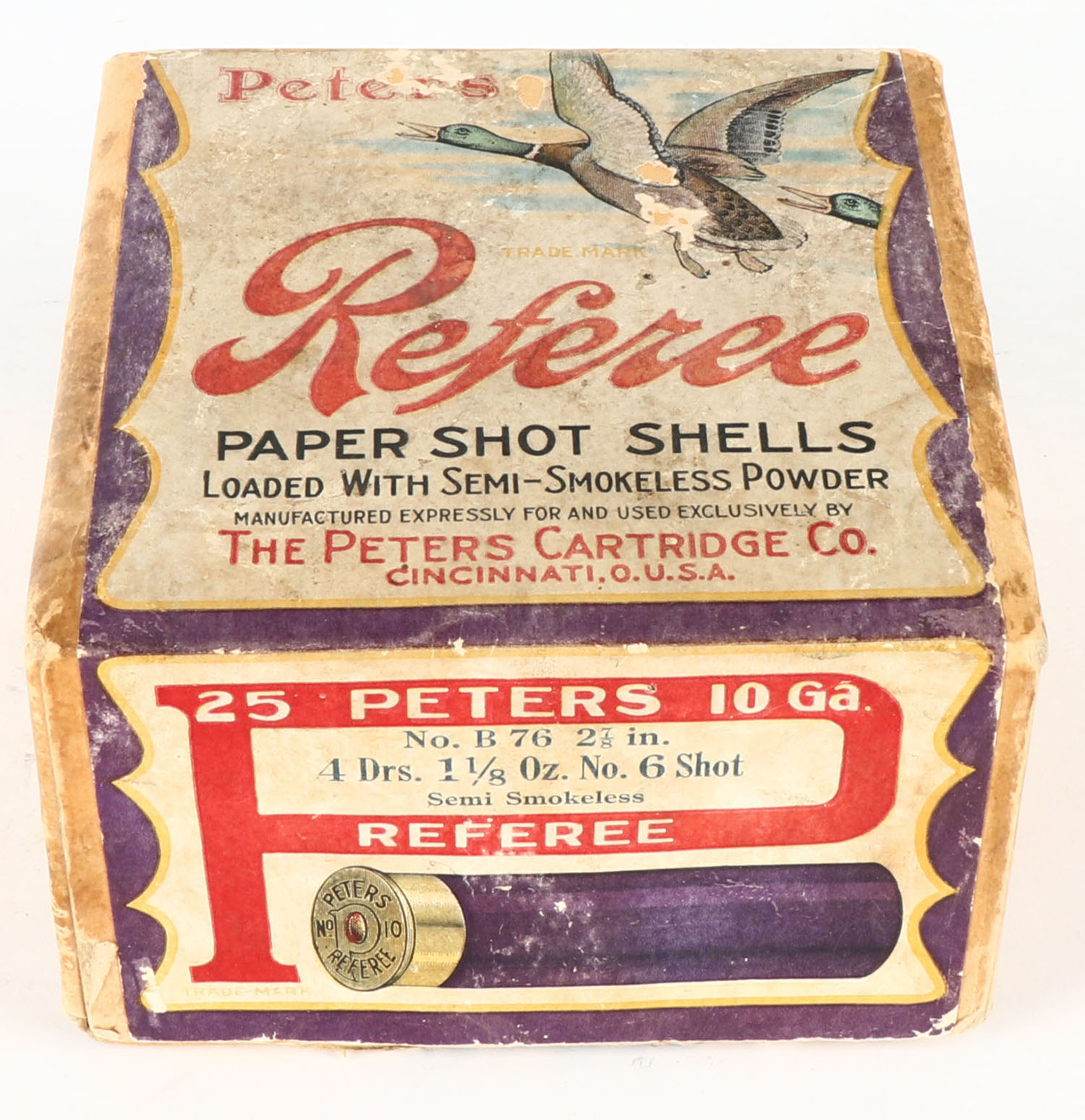 Peter's Cart., Referee, 10ga., 2pc., Partial 17 rds., Shot size 6, Loading: No. B 76, 2 7/8'', 4 Drs., 1 1/8 Oz., No. 6 Shot, buff box with multi-colored label flying ducks, box has light age soiling with scuffing, paper shells are very good. Grade: Very Good ++ - Value: 200 to 500