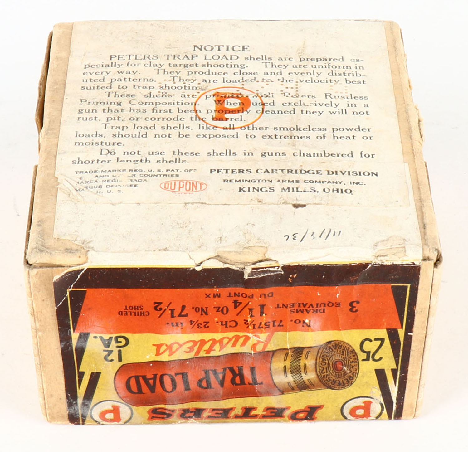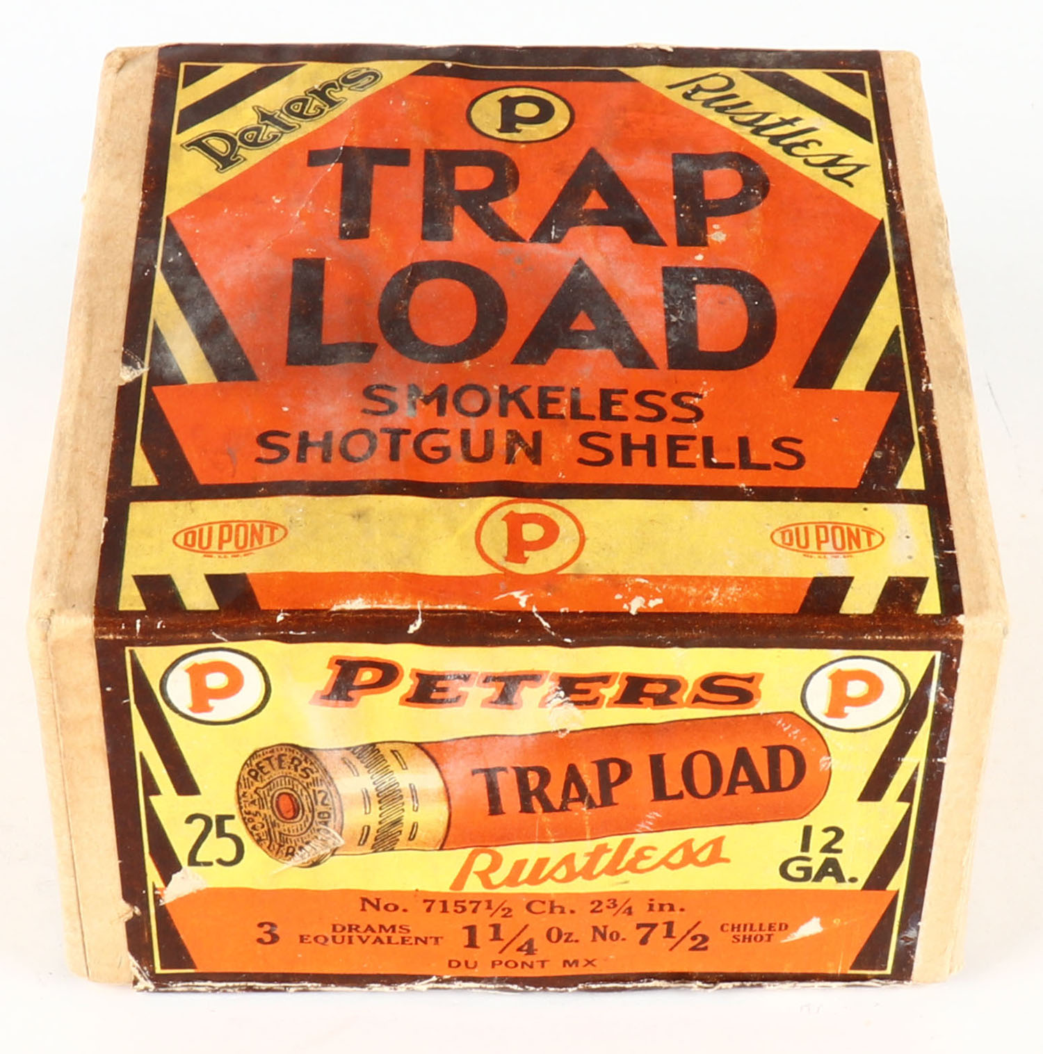 Peters Cart. Co., TRAP LOAD, 12ga., 2 3/4'', 2pc., FULL & SEALED, ''HALLOWEEN BOX'' buff box with orange, yellow, white & black paper label, shot size 7 1/2 Ch., box has light soiling with edge wear, box has excellent colors. Grade: Very Good ++ - Value: 500 to 2500