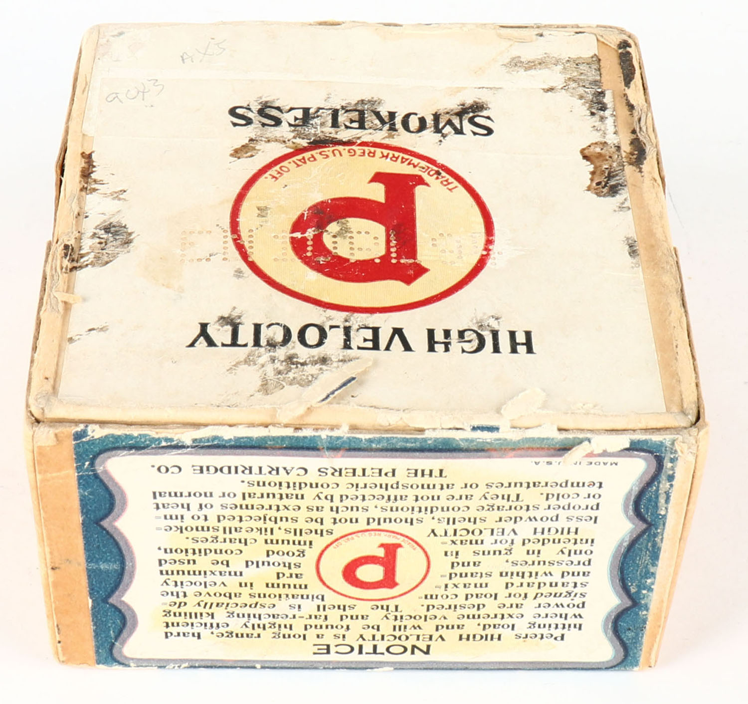 Peters Cart. Co., Blue Wing Teal, OVER STAMPED ''RUSTLESS'', 12ga., 2 3/4'', 2pc., Empty, shot size 7 1/2 CH, buff box with multi colored label that pictures Blue Wing Teal in flight, box has light age soiling & light edge wear with very nice colors. Grade: Very Good ++ - Value: 200 to 500