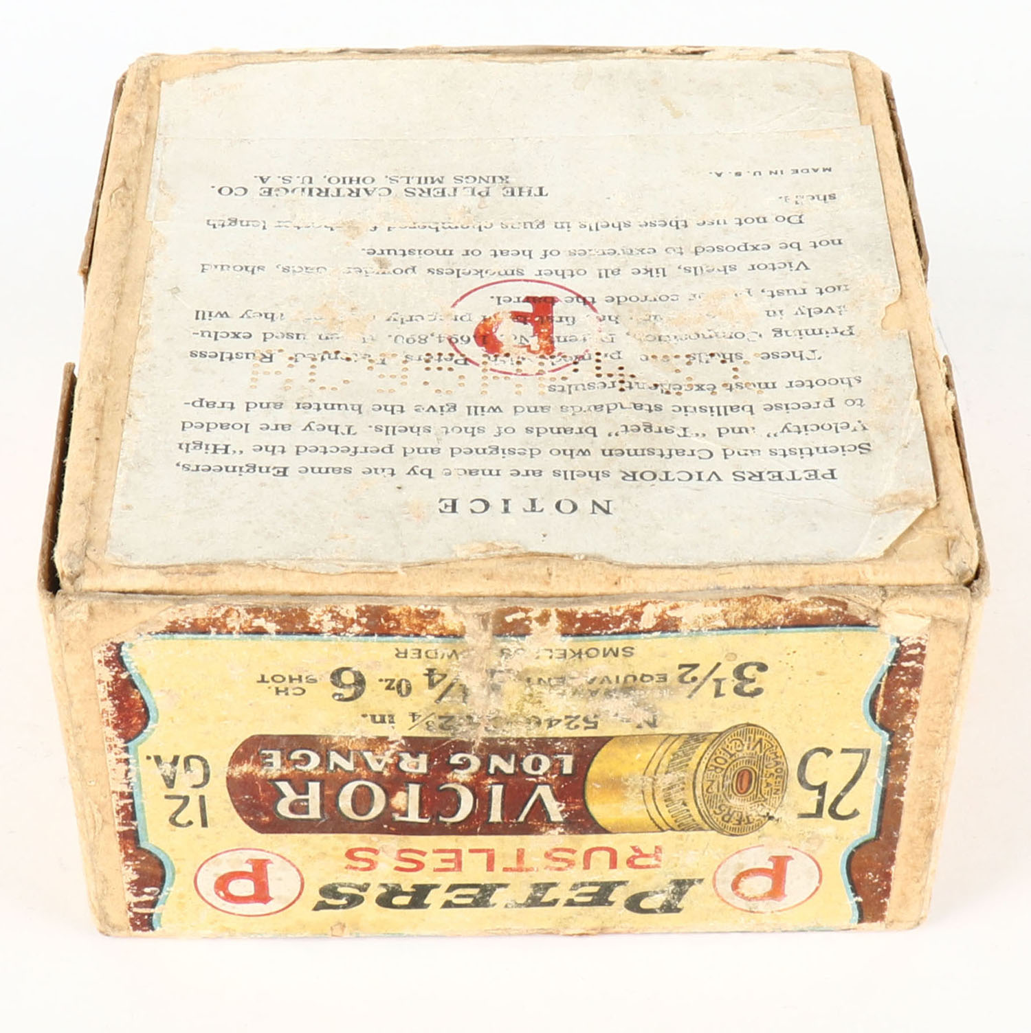 Peters Cart. Div., Victor, Rustless, 12ga., 2 3/4'', 2pc., Empty, shot size 6 CH, buff box with brown, cream & black label, box has scuffing with age soiling. Grade: Good ++ - Value: 50 to 200