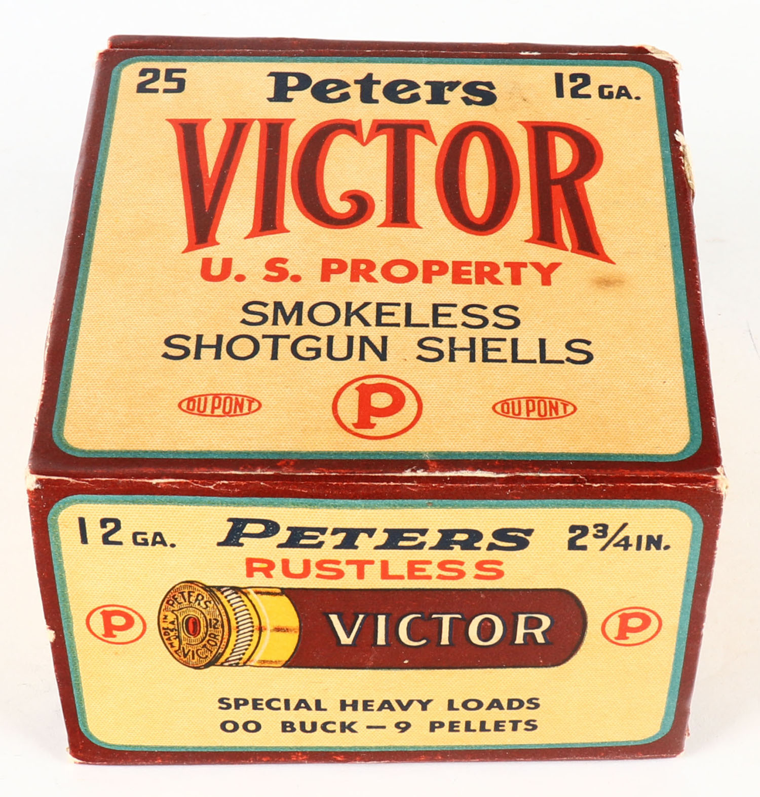 Peters, Victor, U.S. Property 12ga, 1pc., Full, shot size 00 Buck, Maroon, cream & orange box, 2 3/4'', box is very solid with excellent colors, paper shells are excellent. Grade: Excellent + - Value: 40 to 150