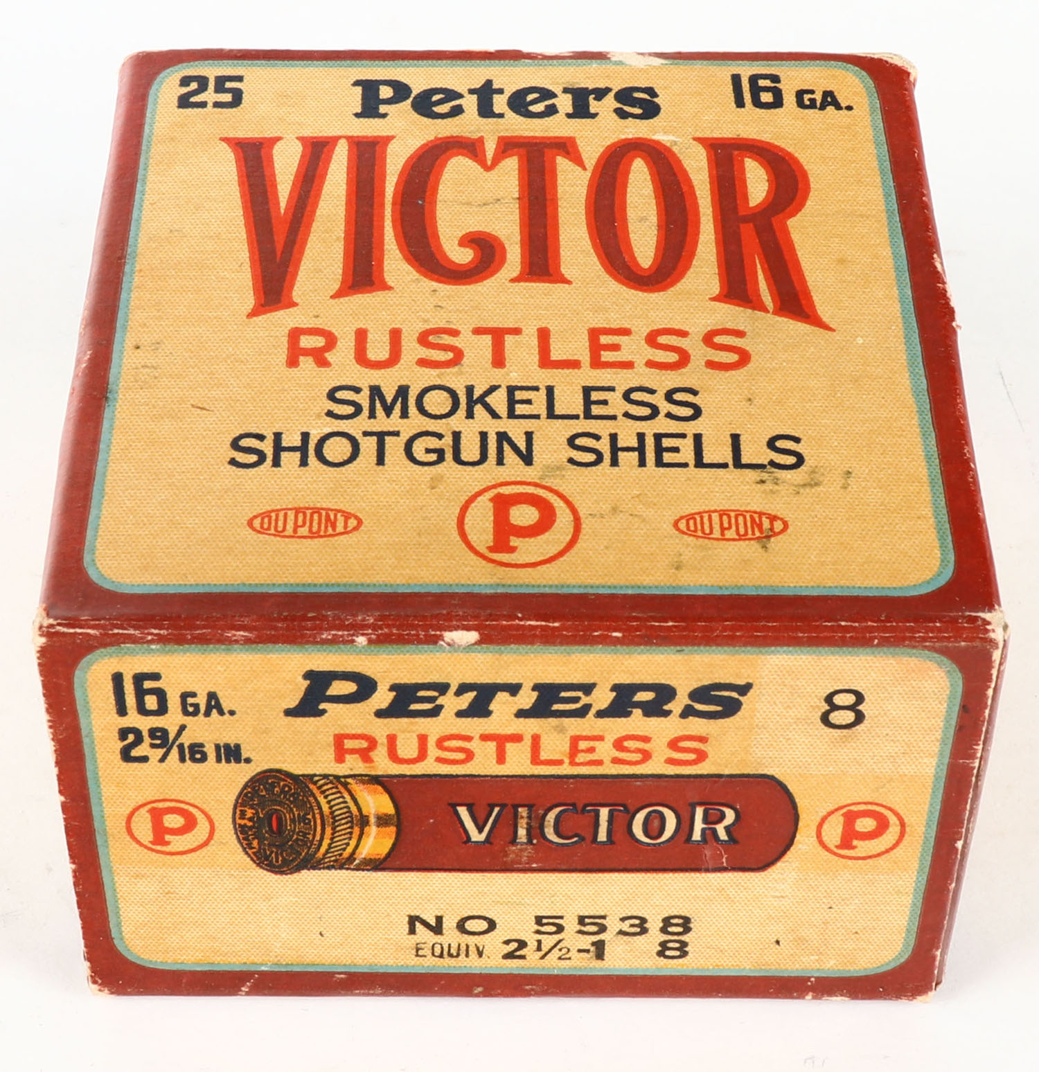 Peters Cart. Div., Victor, Rustless, 16ga., 2 9/16'', 1pc., Empty, shot size 8, maroon, cream & orange box, box is solid with light edge wear. Grade: Very Good ++ - Value: 10 to 40