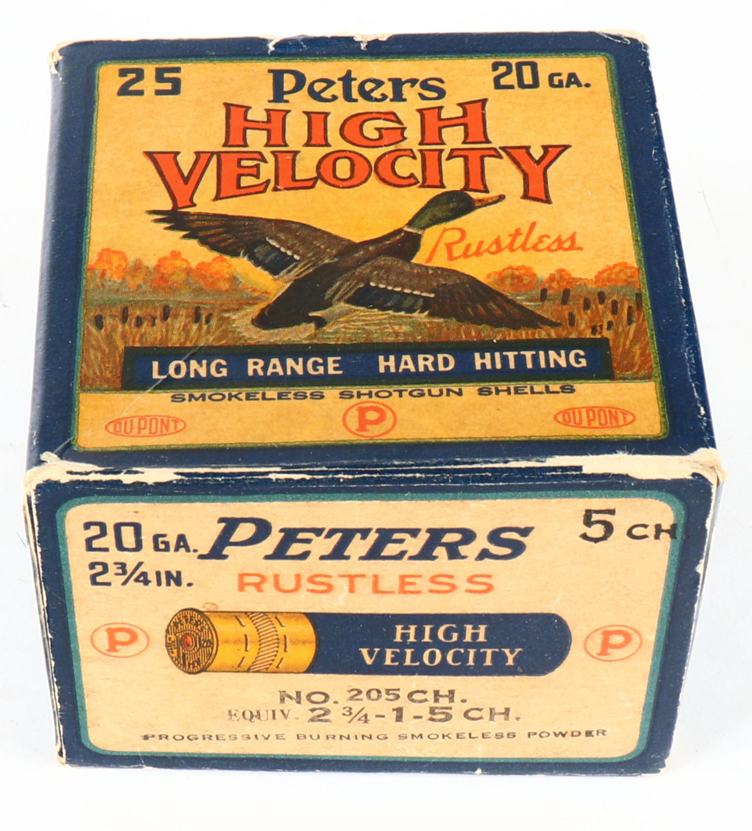 Peters Cart. Div., King Mills, OH, High Velocity, 20ga., 2 3/4'', 1pc., Full, shot size 5 CH, multi colored box that pictures mallard flying out of the marsh grass, box has light edge wear with very nice colors, paper shells are excellent. Grade: Excellent - Value: 40 to 100