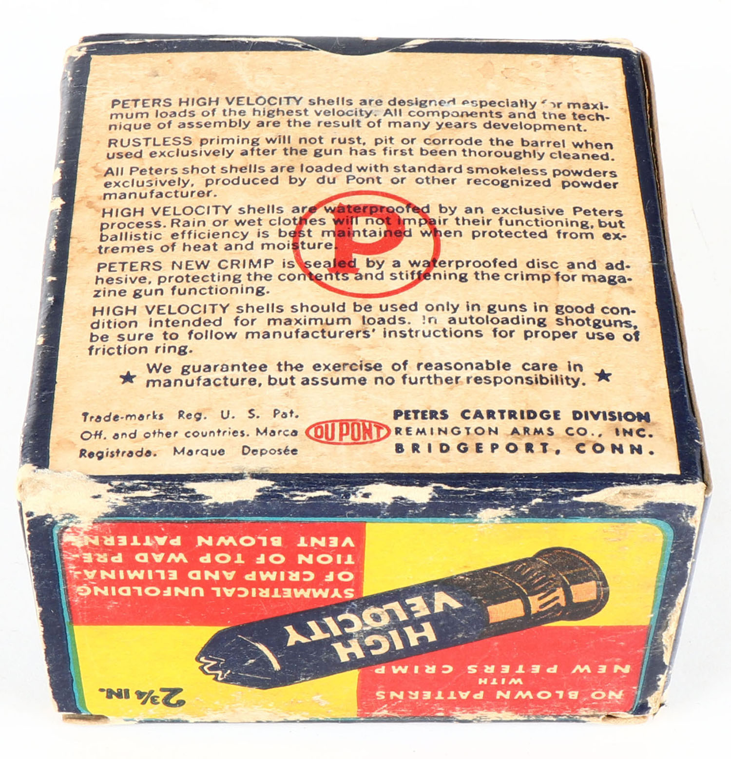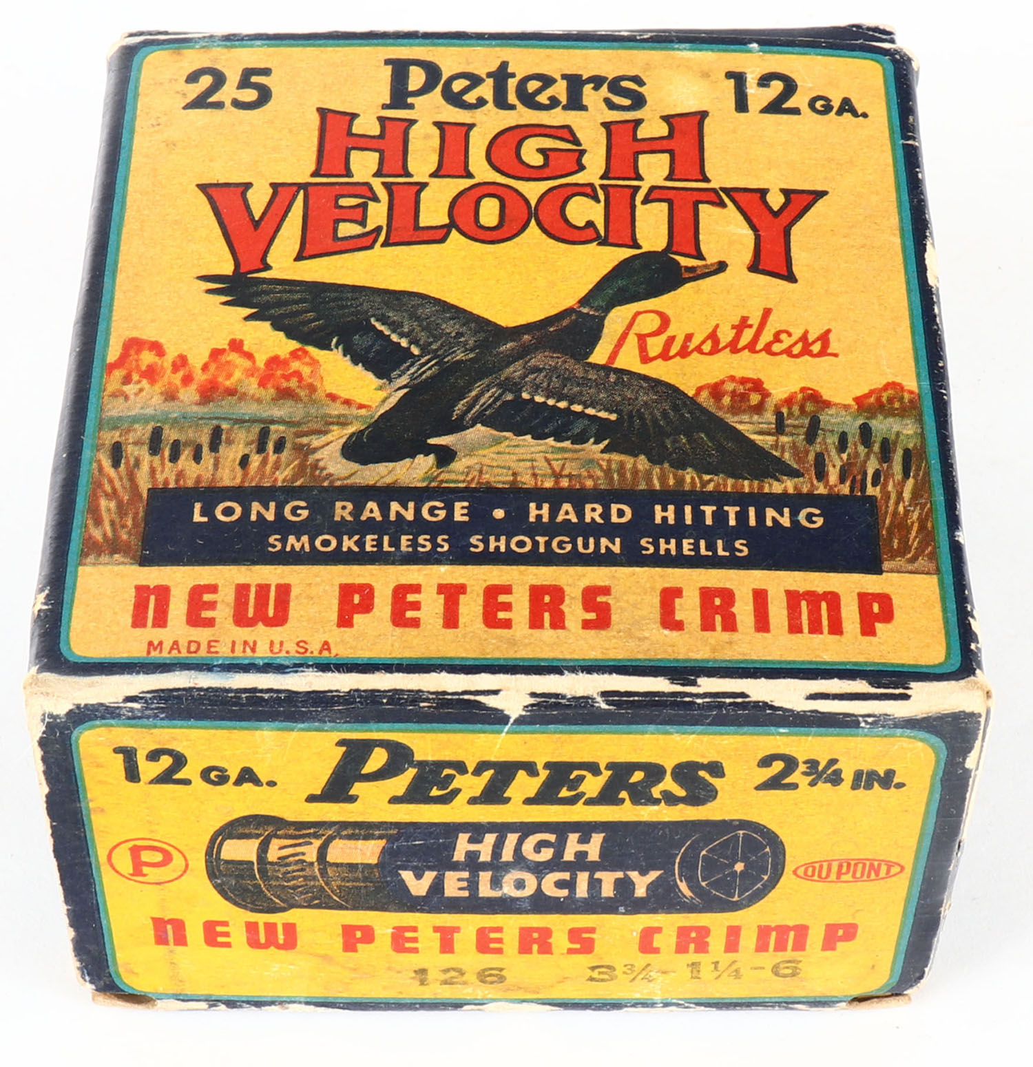 Peters Cart. Co., High Velocity, New Peters Crimp, 12ga., 1pc., Full, shot size 6, multi colored box that pictures mallard flying out of the marsh grass, box is very solid with edge wear, paper shells are excellent. Grade: Very Good ++ - Value: 20 to 60