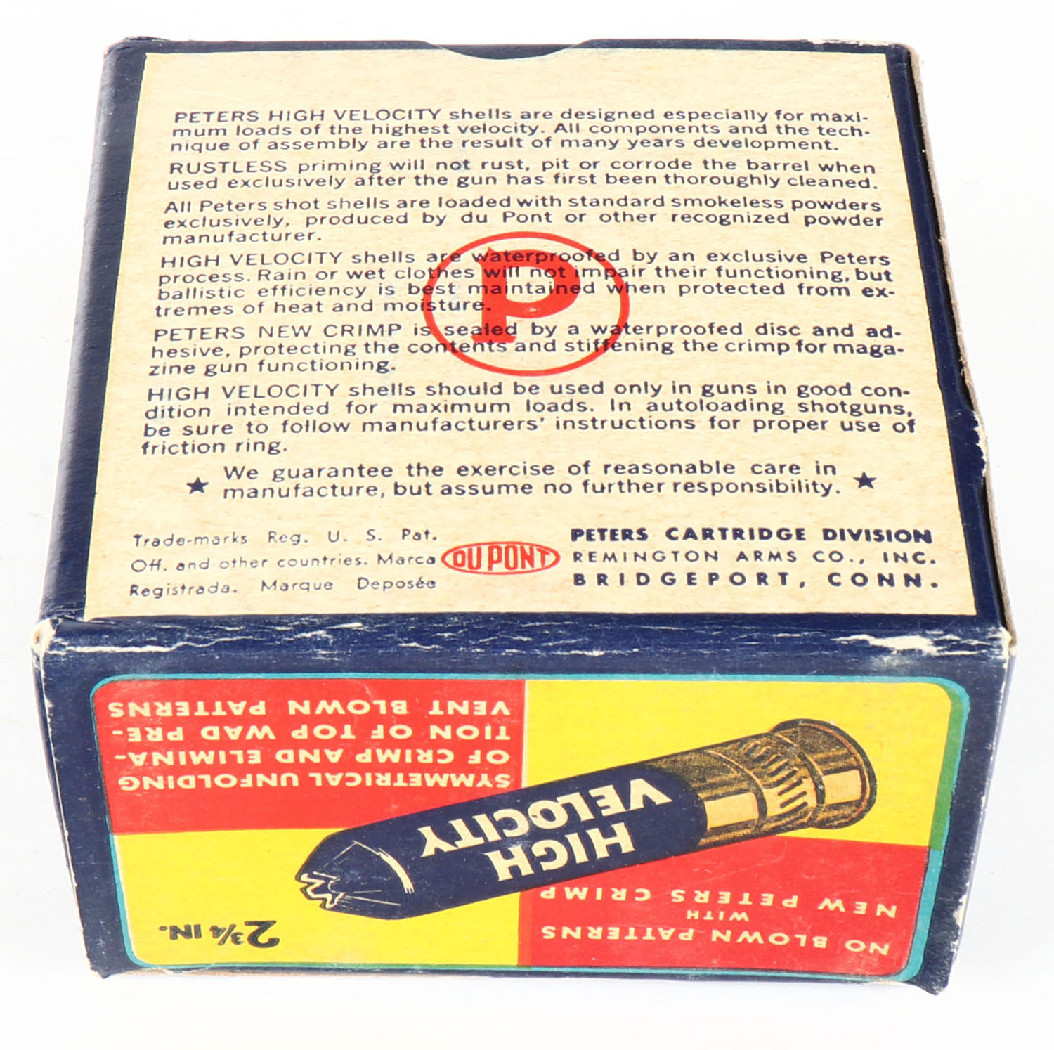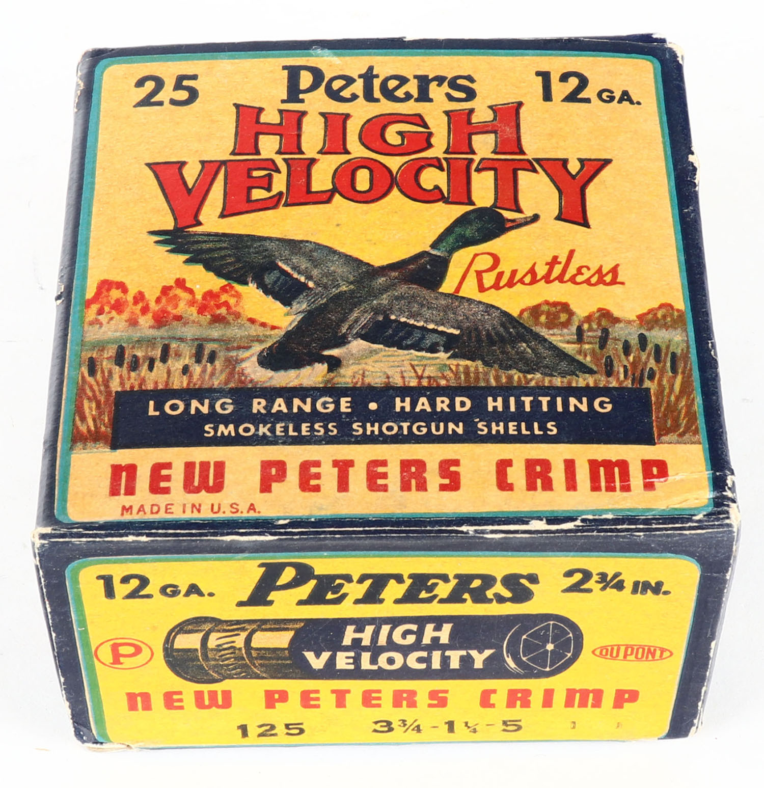 Peters Cart. Co., High Velocity, New Peters Crimp, 12ga., 1pc., Partial 19rds., shot size 5, multi colored box that pictures mallard flying out of the marsh grass, box is very solid with light corner wear, paper shells are excellent. Grade: Very Good ++ - Value: 20 to 60