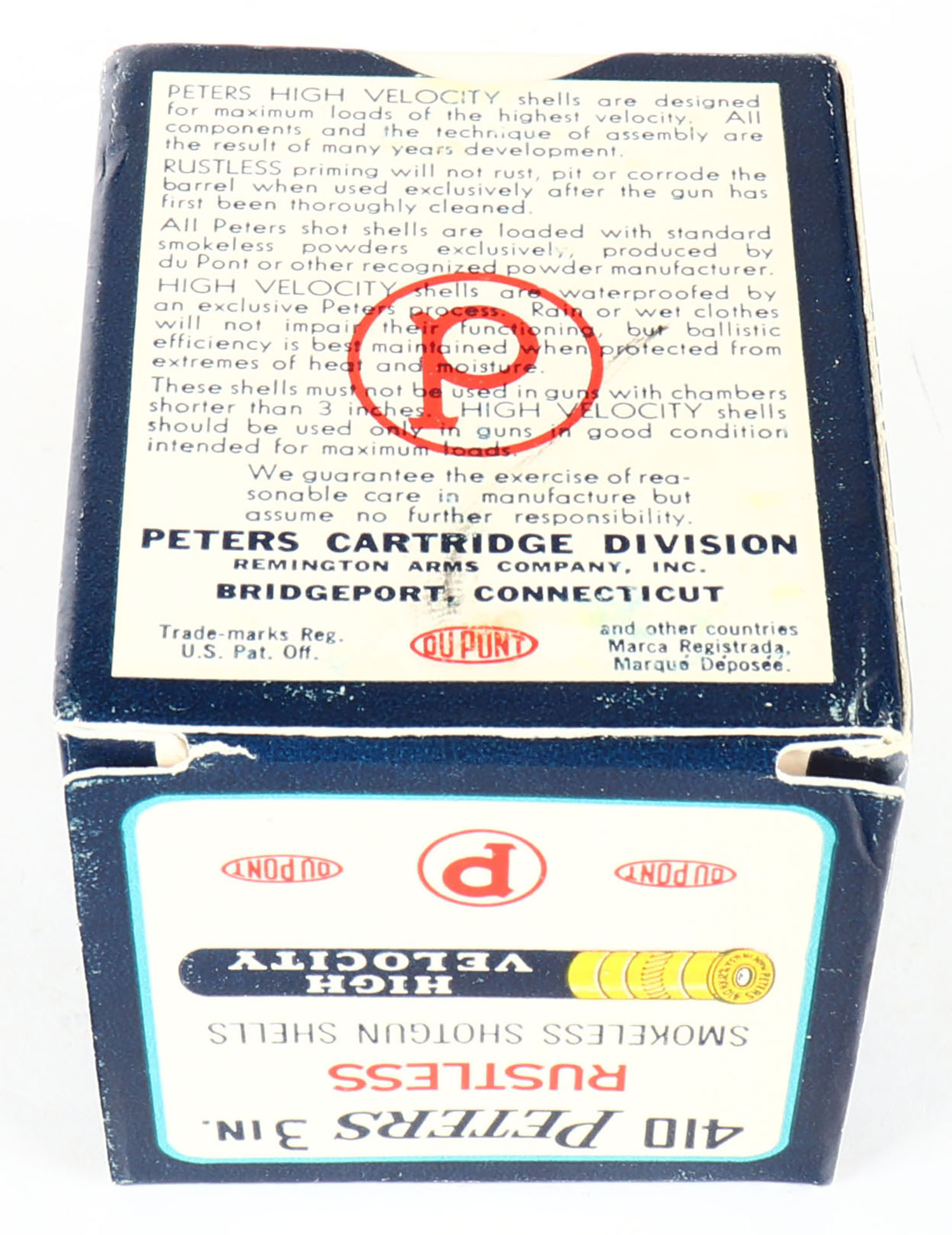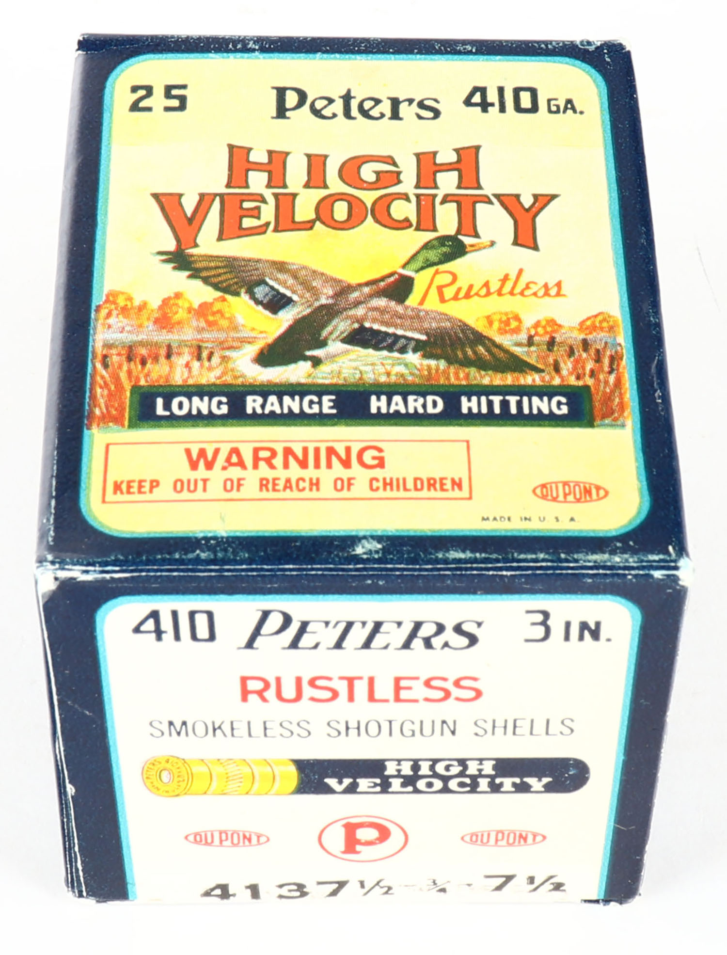 Peters, High Velocity, 410ga., 3'', 1pc., Full, shot size 7 1/2, multi-colored box with mallard duck flying out of marsh grass, box is in excellent condition, paper shells are excellent. Grade: MINT - Value: 40 to 200