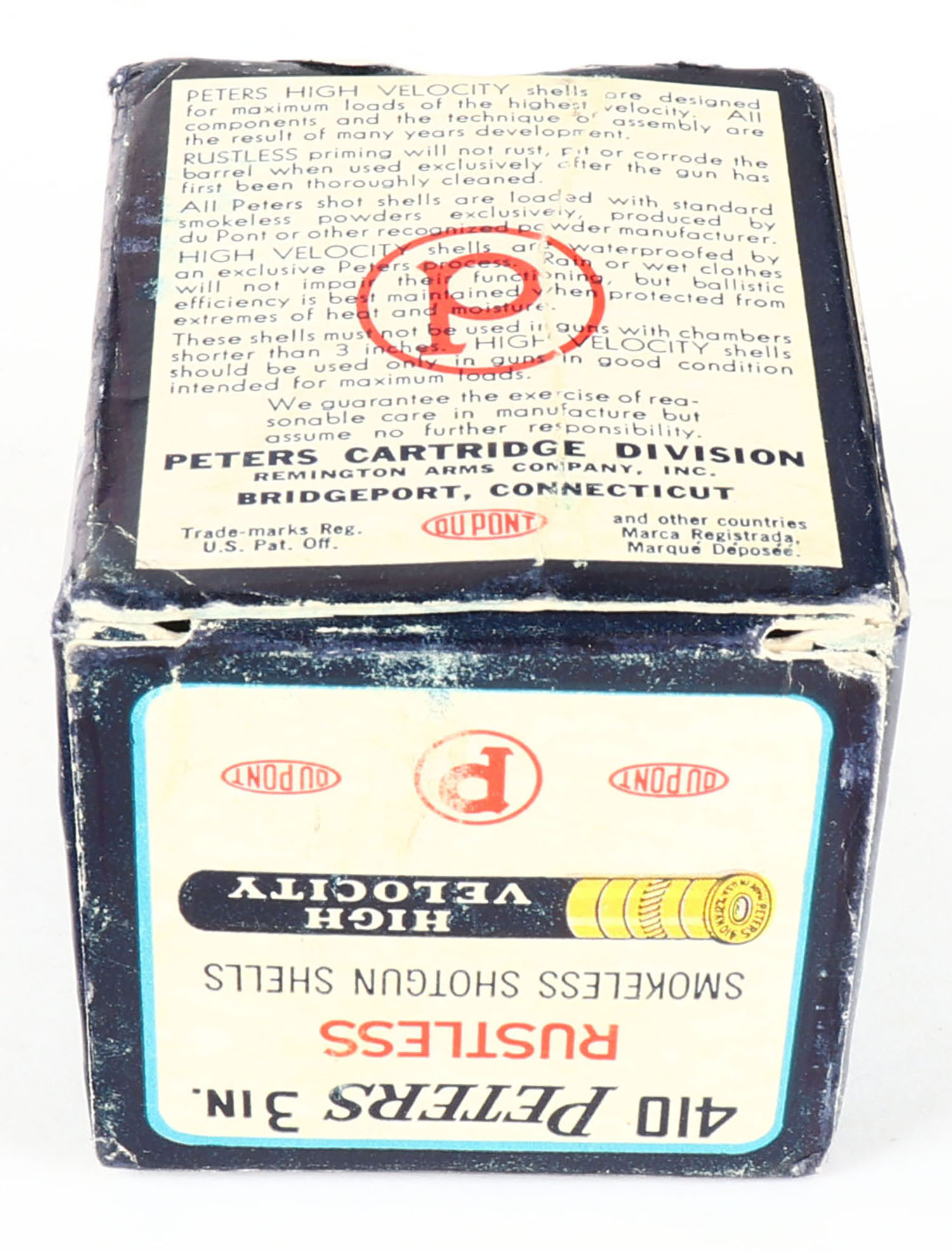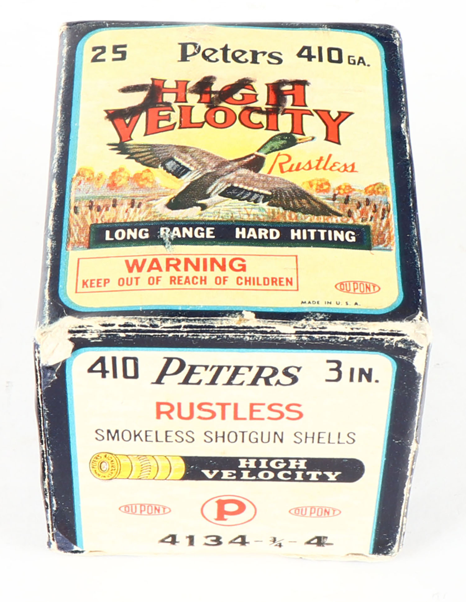Peters, High Velocity, 410ga., 3'', 1pc., Full, shot size 4, multi-colored box with mallard duck flying out of marsh grass, box has light age soiling with edge wear, paper shells are excellent. Grade: Very Good - Value: 40 to 100