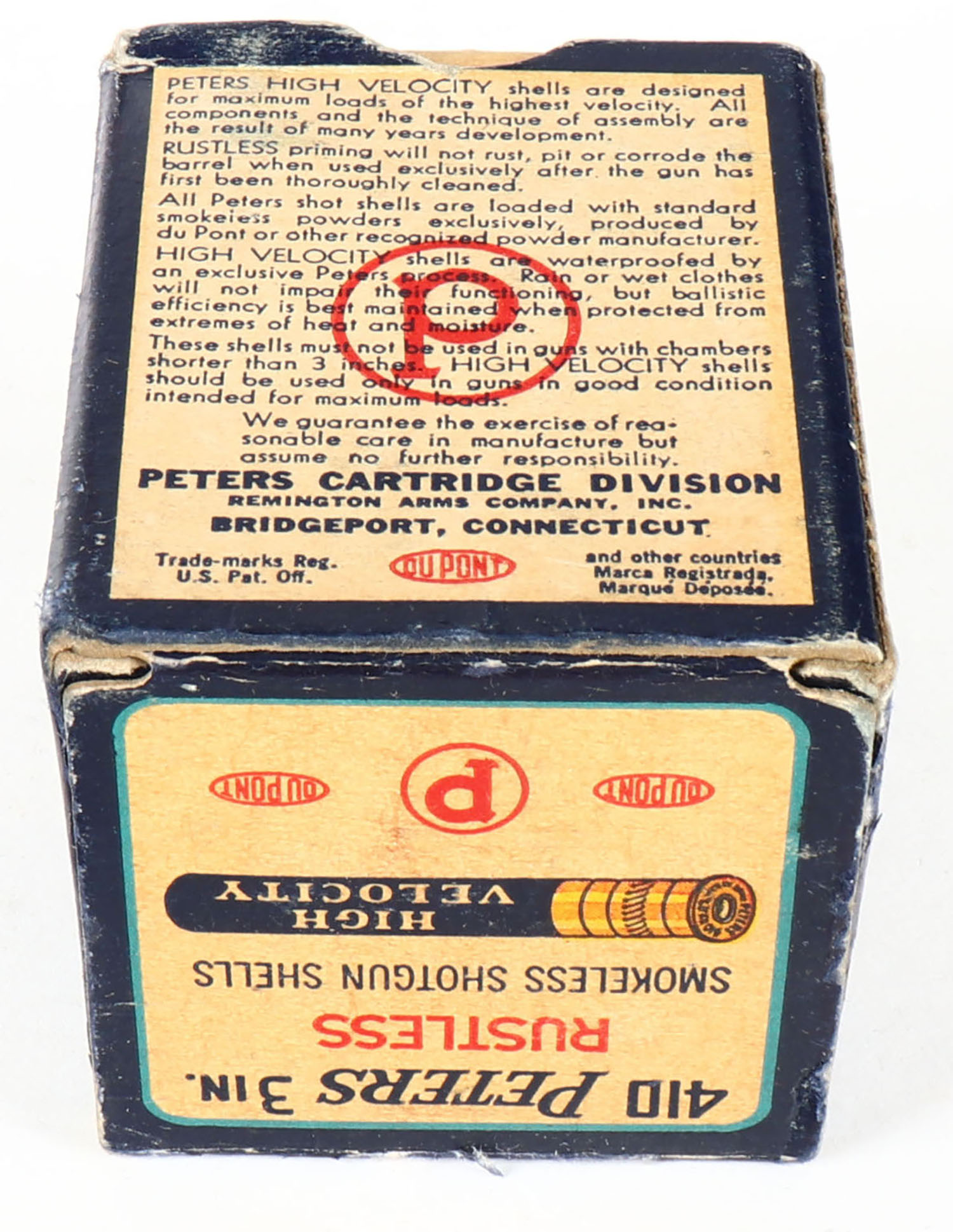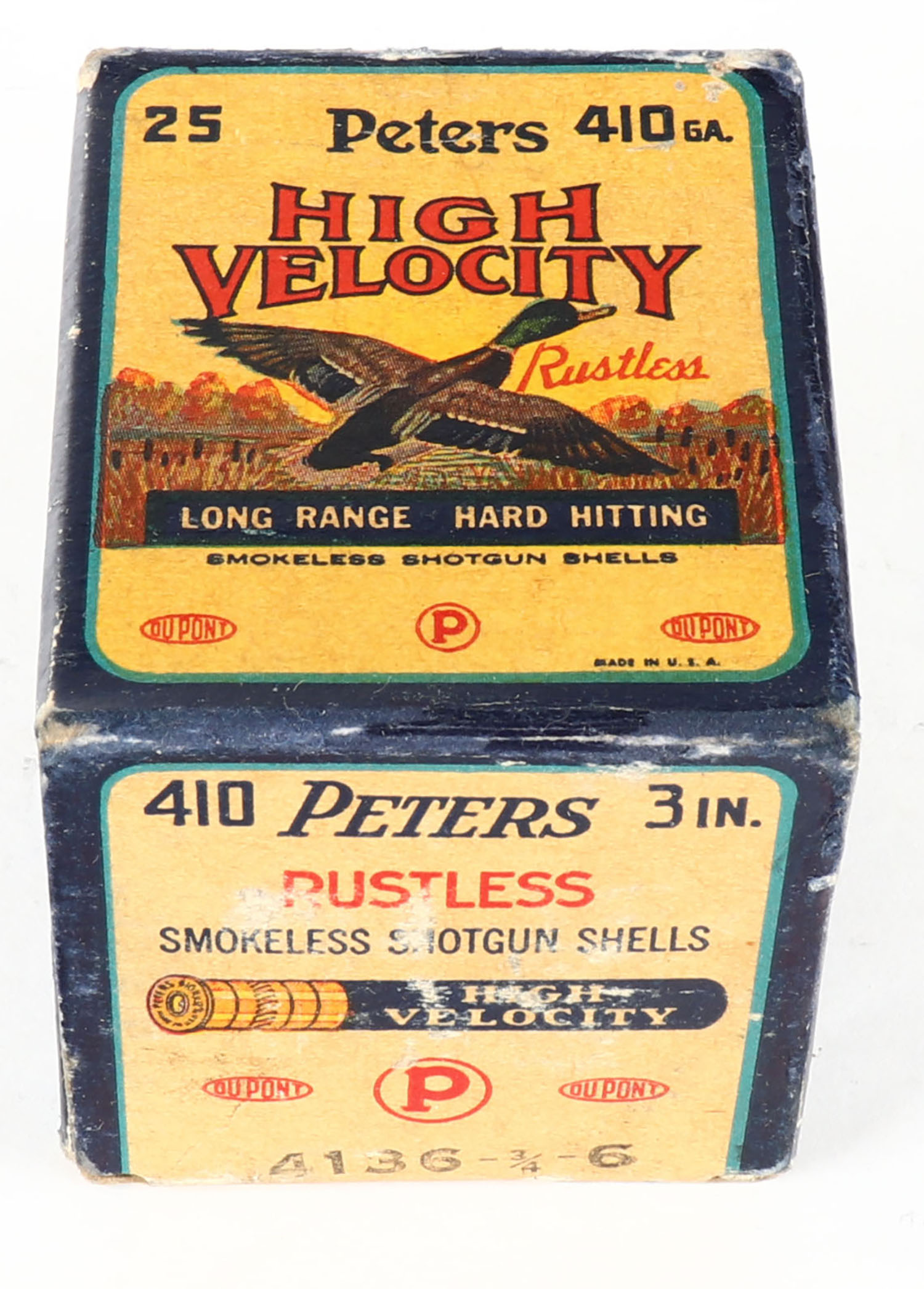 Peters, High Velocity, 410ga., 3'', 1pc., Full, shot size 6, multi-colored box with mallard duck flying out of marsh grass, box has age soiling with edge wear, paper shells are very good. Grade: Very Good - Value: 40 to 100
