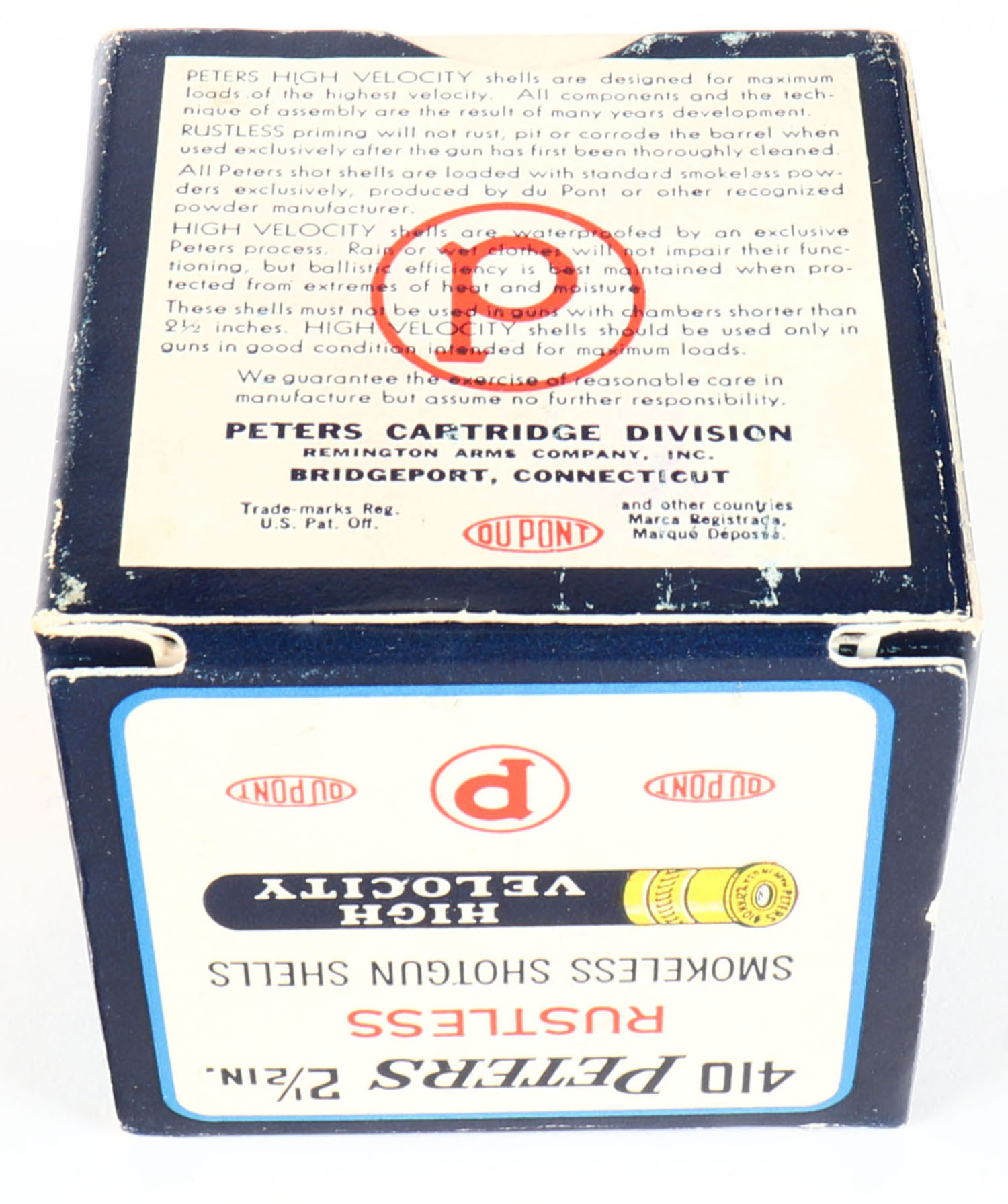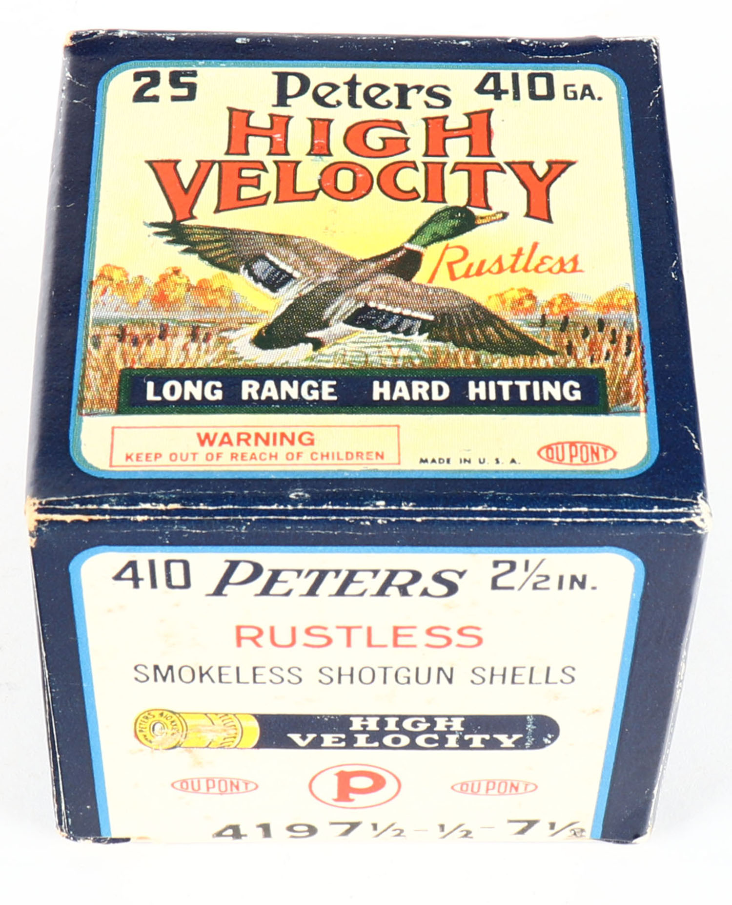 Peters, High Velocity, 410ga., 2 1/2'', 1pc., Full, shot size 7 1/2, multi-colored box with mallard duck flying out of marsh grass, box is very solid with excellent colors, paper shells are excellent. Grade: Excellent ++ - Value: 40 to 100