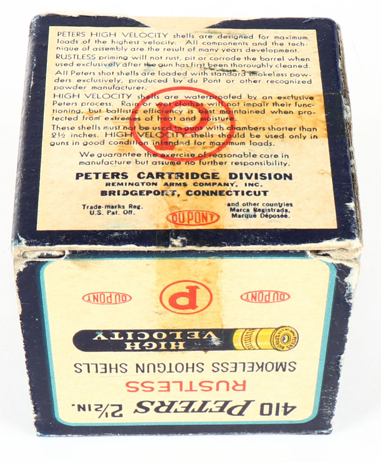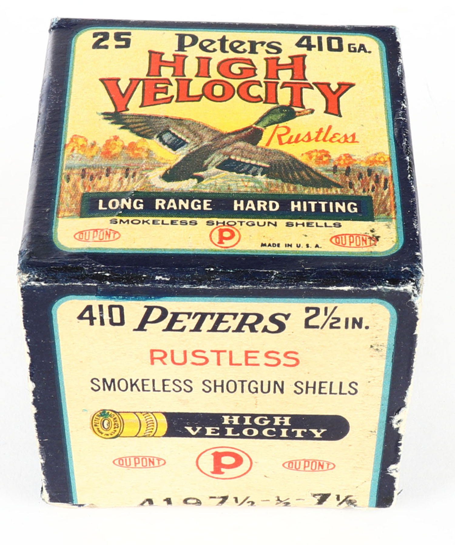 Peters, High Velocity, 410ga., 2 1/2'', 1pc., Full, shot size 7 1/2, multi-colored box with mallard duck flying out of marsh grass, box has light scuffing with edge wear, paper shells are excellent. Grade: Very Good + - Value: 40 to 100