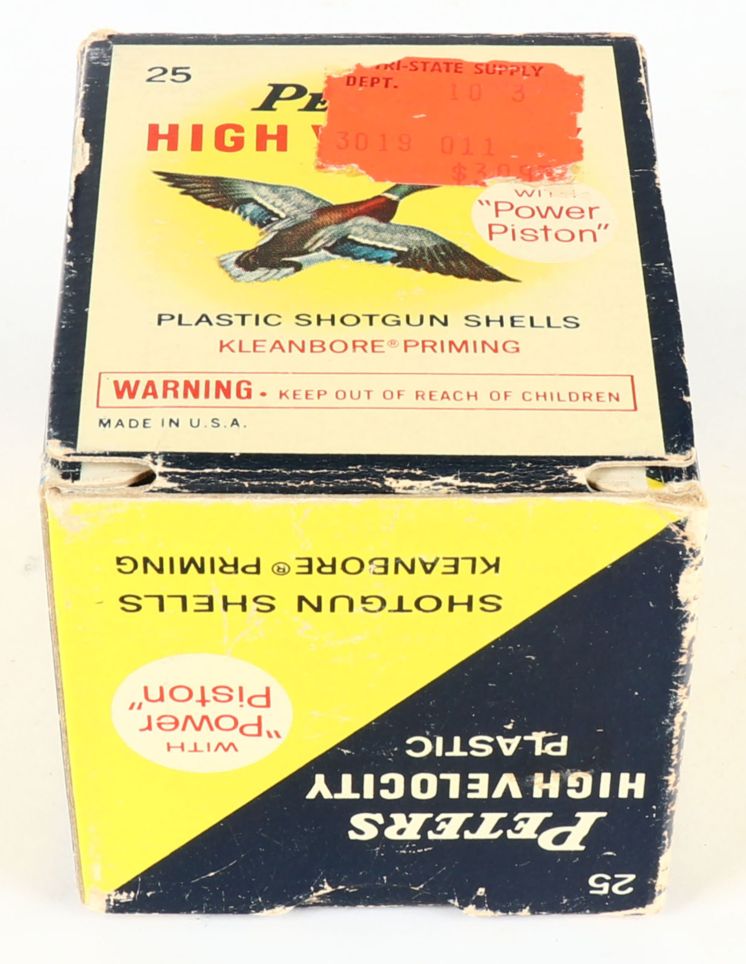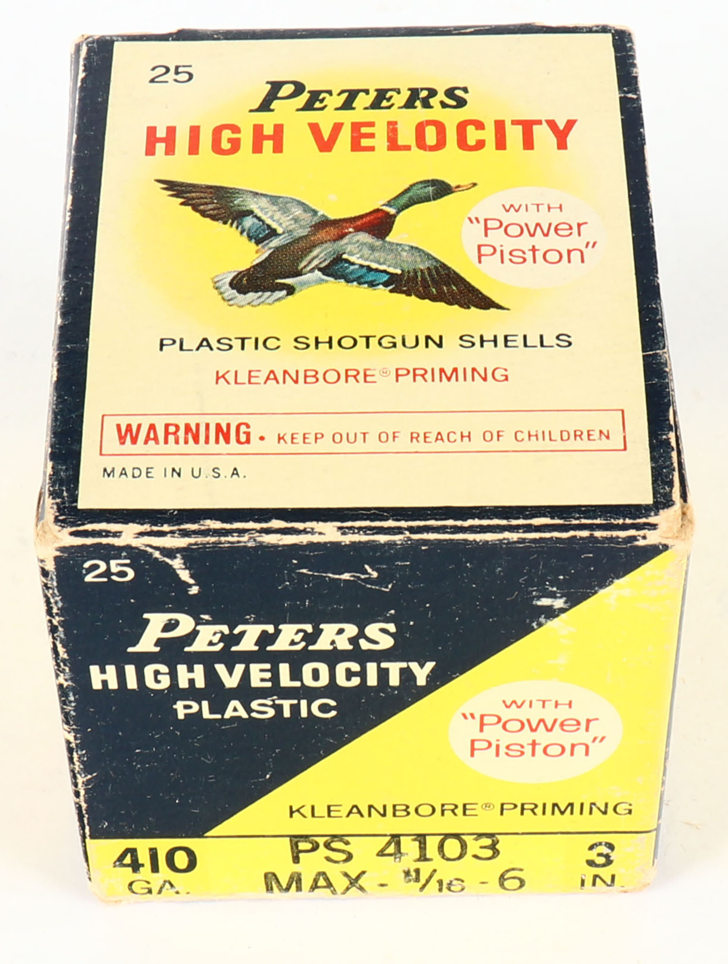Peters Cart. Co., High Velocity, 410ga, 3'', 1pc., Full, shot size 6, multi colored box that pictures mallard flying, box has edge wear with light scuffing, plastic shells are very good. Grade: Very Good + - Value: 10 to 40