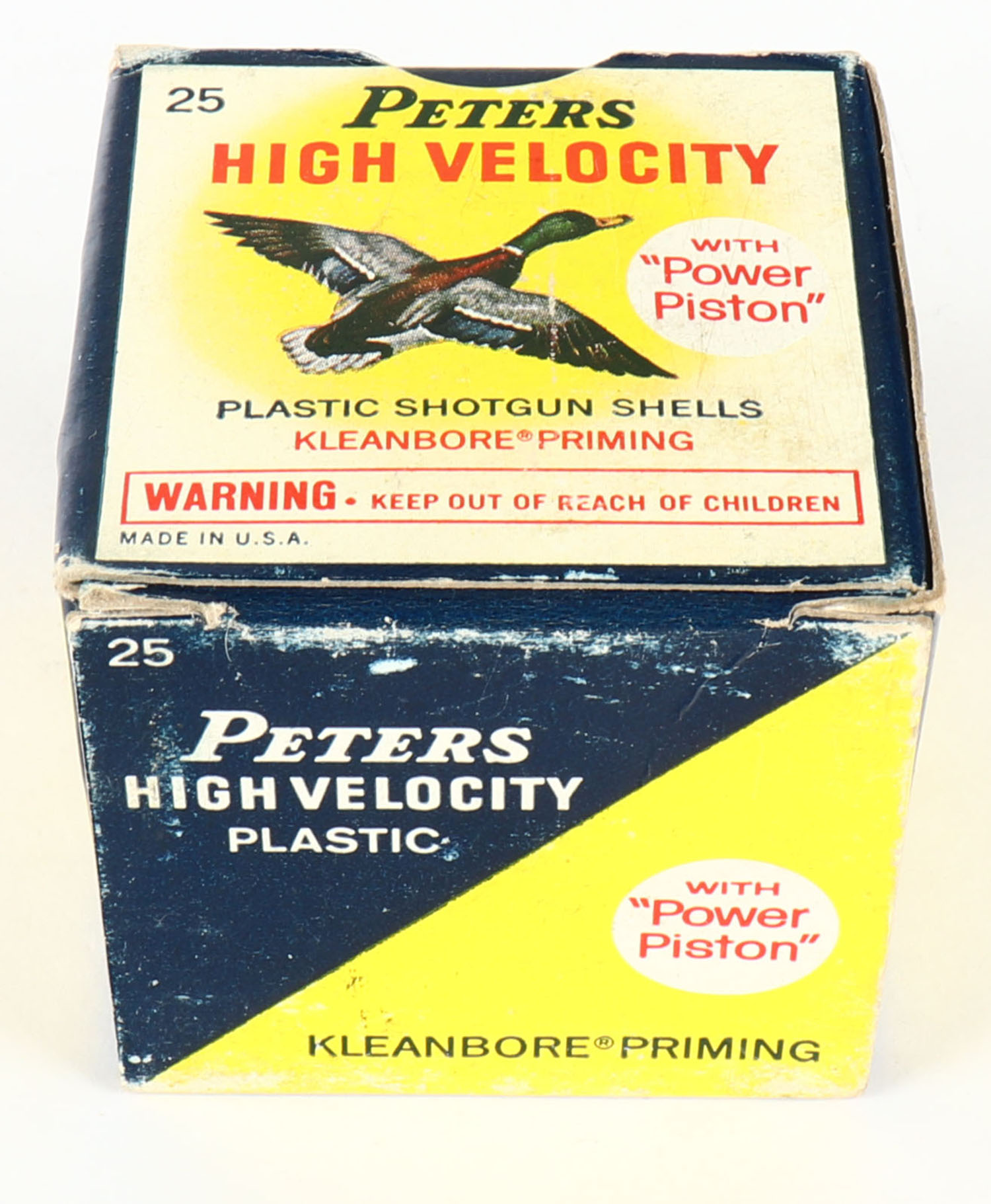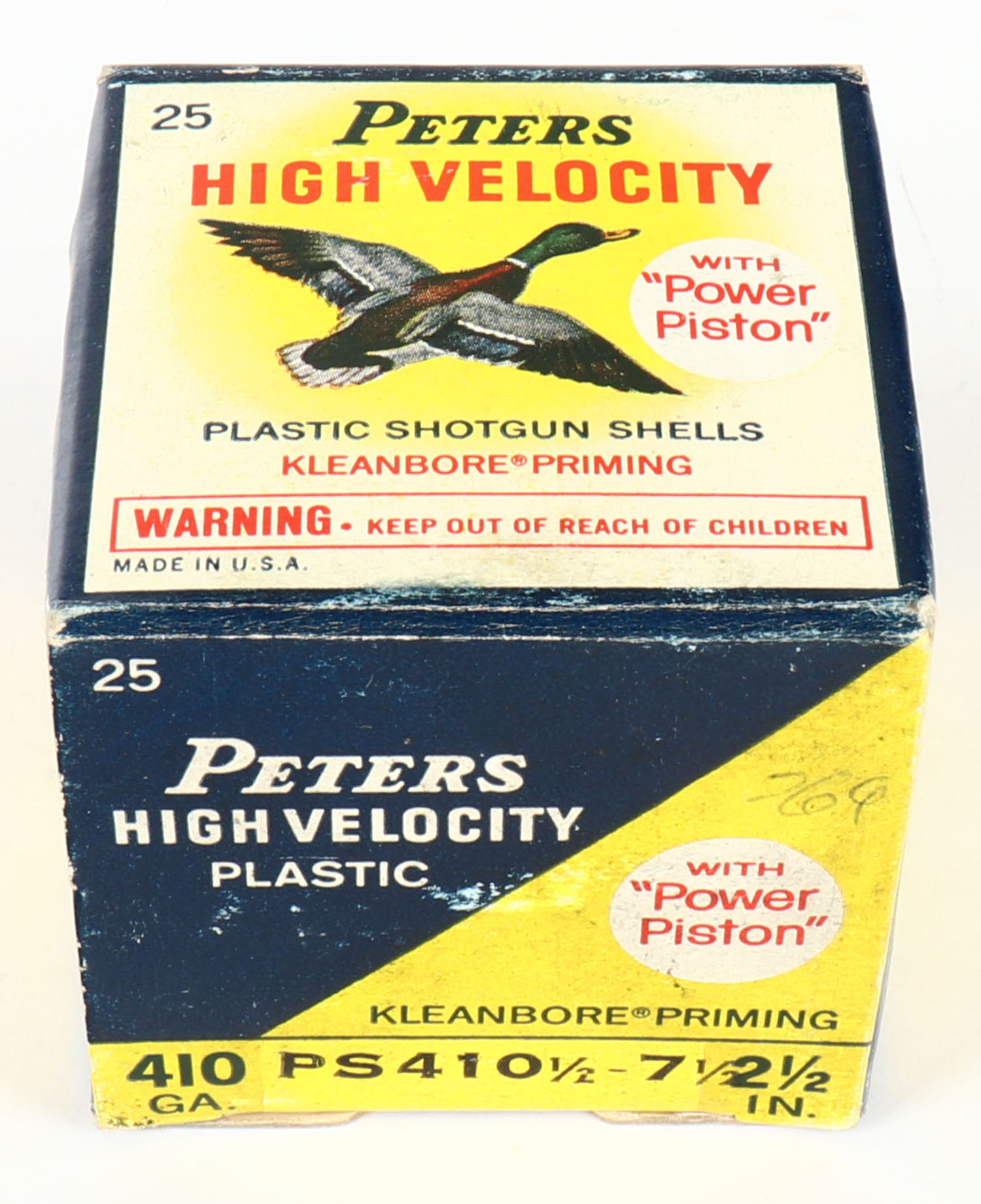 Peters Cart. Co., High Velocity, 410ga, 2 1/2'', 1pc., Full, shot size 7 1/2, multi colored box that pictures mallard flying, box has edge wear & light age soiling, plastic shells are excellent. Grade: Very Good + - Value: 10 to 40