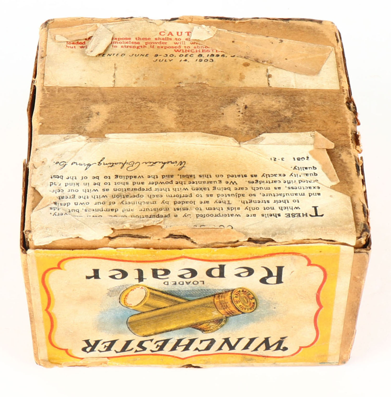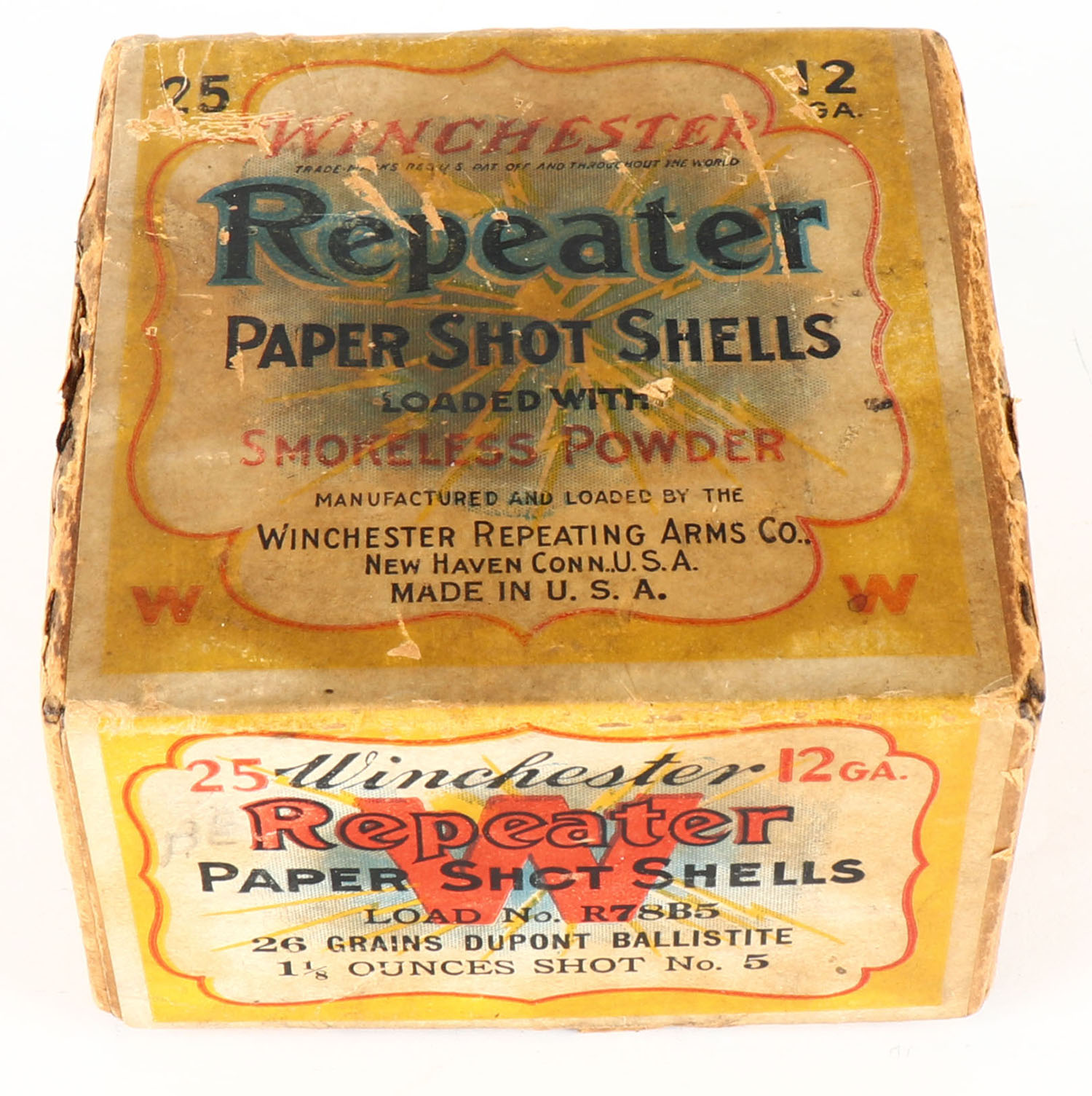 Winchester, REPEATER, 12ga., 2pc., Full, shot size 5, buff box with yellow, white & red label showing lightning bolt, box has age soiling & scuffing with a partial seam split, paper shells are excellent. Grade: Very Good - Value: 40 to 100